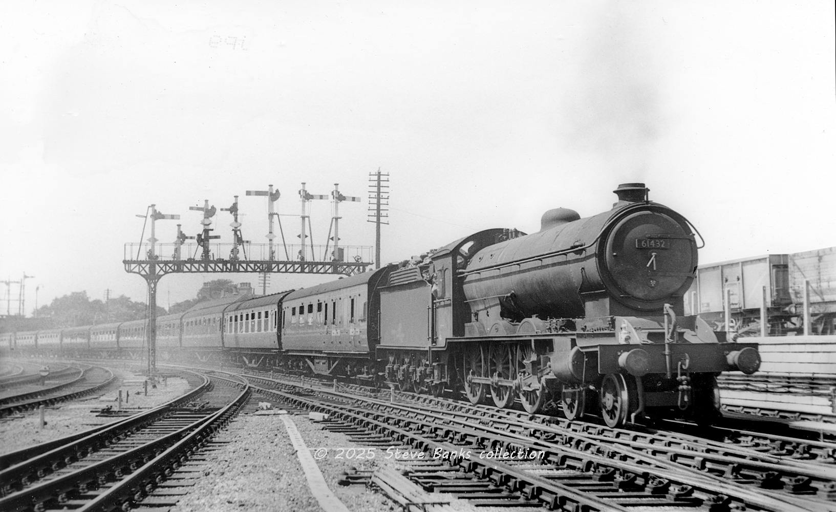 Raven B16/1 No 61432 was at Neville Hill for most of the BR period until withdrawal but is seen here at Bridlington in 1948-49 either just before reallocation or still carrying a 50A shedplate with a train from the LMR made up of at least ten Stanier coaches. It looks like a late 1950s scene but many of the coaches are still in LMS crimson lake livery, the leading BTK not built until after nationalisation and given an "M" prefix to the number, while others are already in BR carmine and cream.