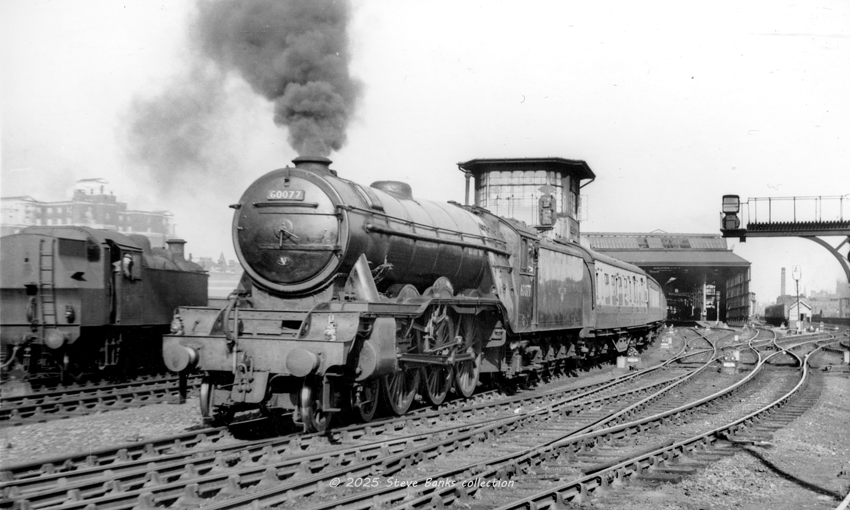 A marvellous but undated view of A3 No 60077 The White Night leaving the station with an unidentified express, the coaches in carmine & cream.