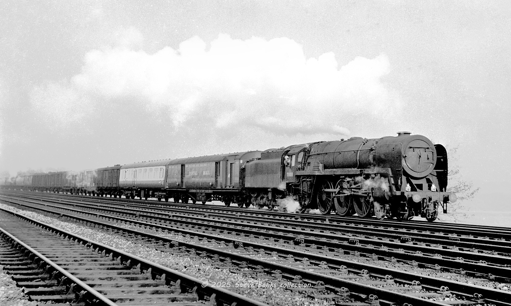 Very late in the loco's operational life, with nameplates and smokebox number plate removed and the second vehicle (behind an ex-LMS TPO) is a BR Mk.2 BFK in blue and grey livery, so probably 1966 onwards.