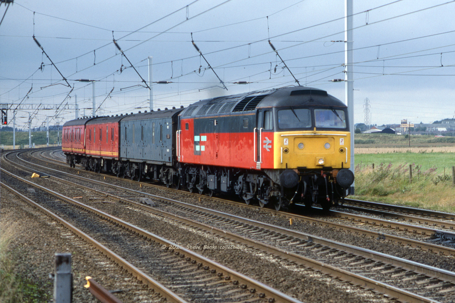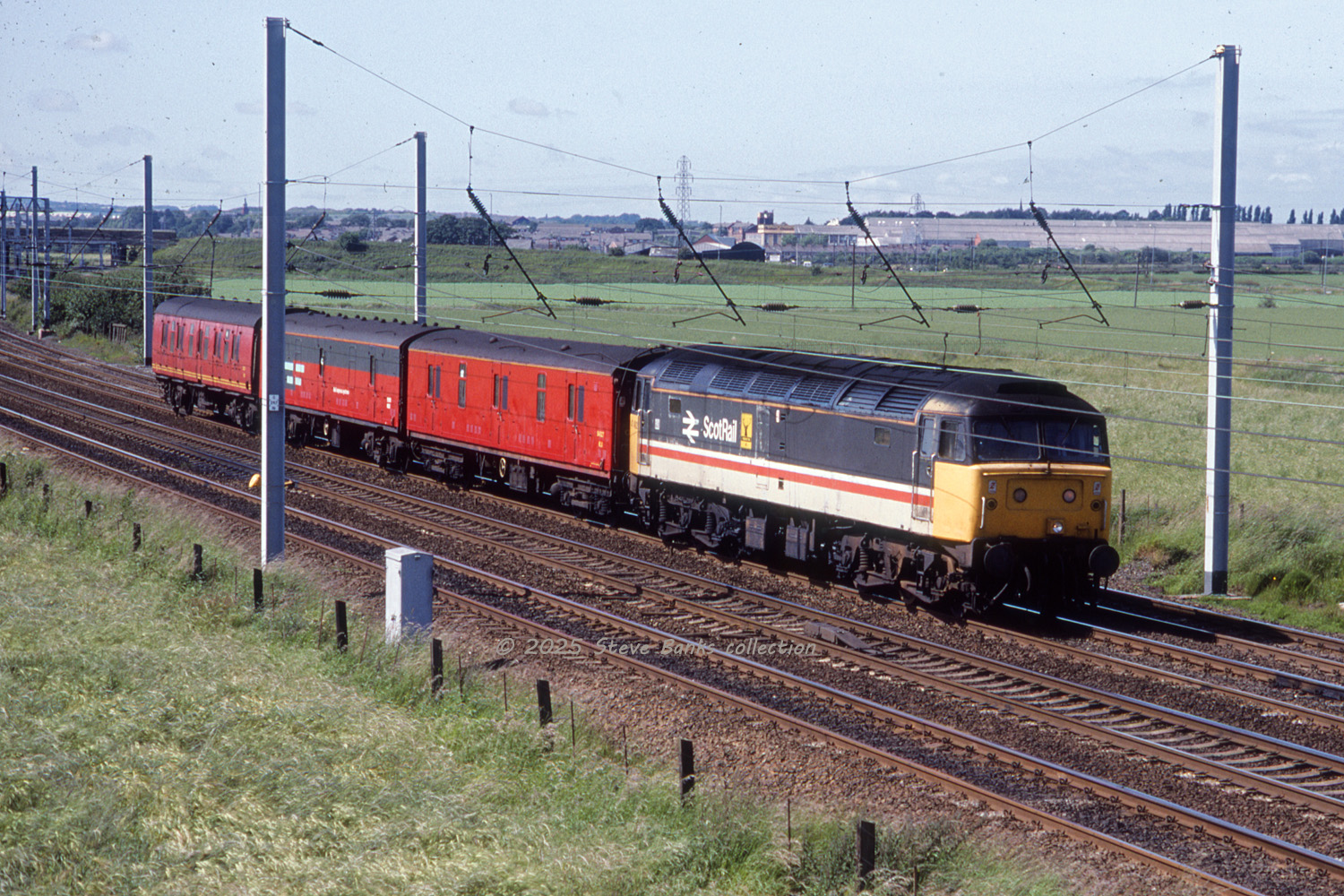 47492 in Scotrail livery is at Winwick in Cheshire on 22nd June 1993 with a three van train with variations in Parcels Sector red livery: