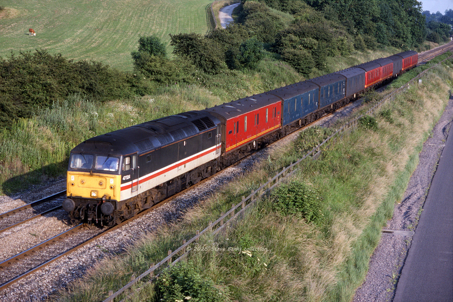 47594 Resourceful looking imacculate in Parcels Sector red was captured near March on 6th August 1993 with a 12 coach parcels train in a mixture of liveries, BR blue & grey on five of the BGs, and Parcel Sector red on the rest of the BGs and GUVs.
