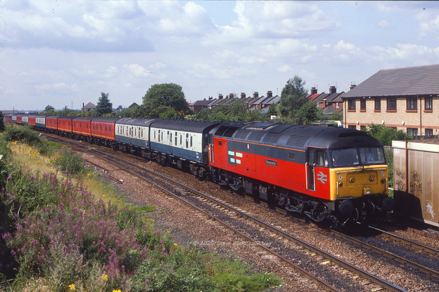 31450 swings off a curve at Crewe on 11th August 1990 with the vans reduced to two BR designs: GUV and Mk.1 BG. In colour the various degrees of weathering really stand out, with a tendency for the BGs, which were also being used with passenger trains, to be cleaner. [Same picture as in the Rly. Modeller article].