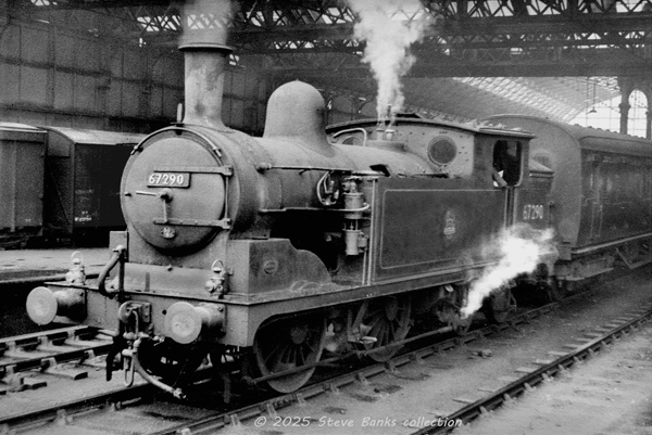 Neville Hill provided vacuum fitted pilots for the ex-LNWR&NER side at Leeds City and this is G5 No 67290 (with Westinghouse pump) at the west end and the earliest BR-period picture I have from Wednesday 10th June 1953. It's carrying BR mixed traffic livery, a 50B shedplate and a full set of pilot lights. The leading coach is a Thompson 52'4" brake, possibly a BT(4) and part of one of the local 3- or 4-sets. Photo: Ralph Thurlow.