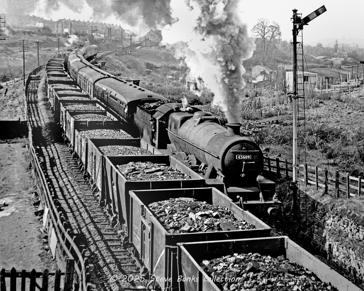 It's April 2nd 1951 and ex-LMS Jubilee Class 4-6-0 No.45609 Gilbert and Ellis Islands is passing a coal train at Kingswood in South Gloucestershire. Different grades of coal have been loaded to well below the top edge of the wagons, except for the 6-plank merchandise wagon which is overflowing. It was not unknown for wagons like this to find themselves in coal trains and they show in many photographs. Three wagons nearest the camera are carrying what may be a rough sorted industrial variety. Intriguingly, they are relatively modern steel mineral wagons.