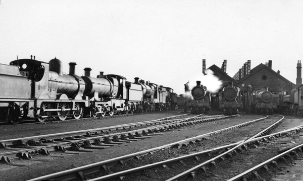 An enlargement of the line-up in the 1935 general view shows, from left to right: Dean goods No 2383; an unnamed "Bulldog"; a GC-design ROD 2-8-0; and possibly a 43xxx 2-6-0. Photo: LGRP.
