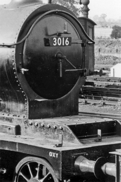 A closer view of the above ex-ROD No.3016 showing the BR-style number-plate on the smokebox door and GWR-style shed code for Oxley painted on the side of the running plate. It is believed that the cast shed plates didn't star being used by ex-GWR sheds until 1950 when Banbury became 84C. Photo: Mick Green Collection.