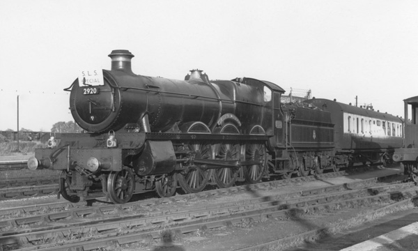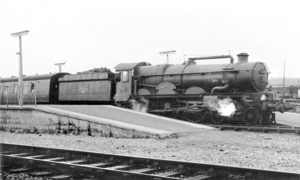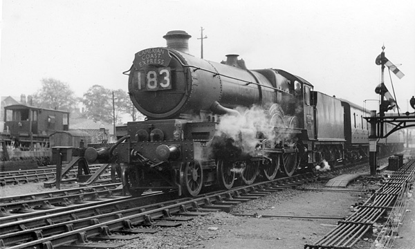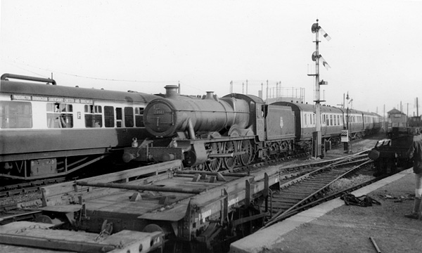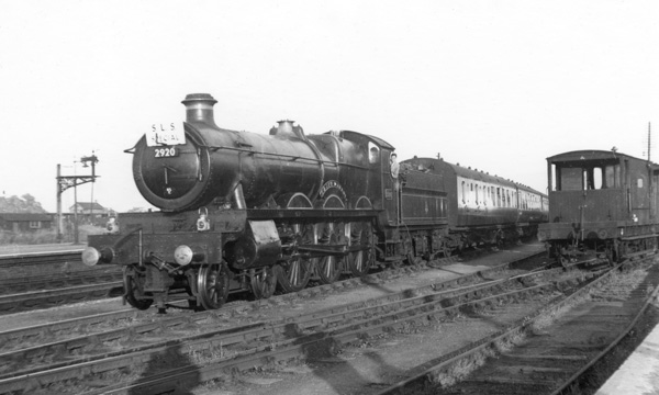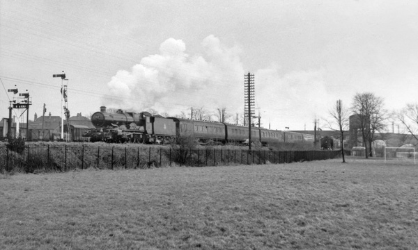 Seen on a fine late summer Saturday in 1929 from Banbury North Signal Box with a little motion blue on the front, recently converted from a "Star", "Castle" No 4037 Queen Philippa, still with a small tender, swings past the north yards on the approach to the station with an express, probably from Birmingham or Wolverhampton. 7th September 1929. The loco was renamed The South Wales Borderers in 1937. Photo: CM & JM Bentley, believed to have been taken by W. Leslie Good.
