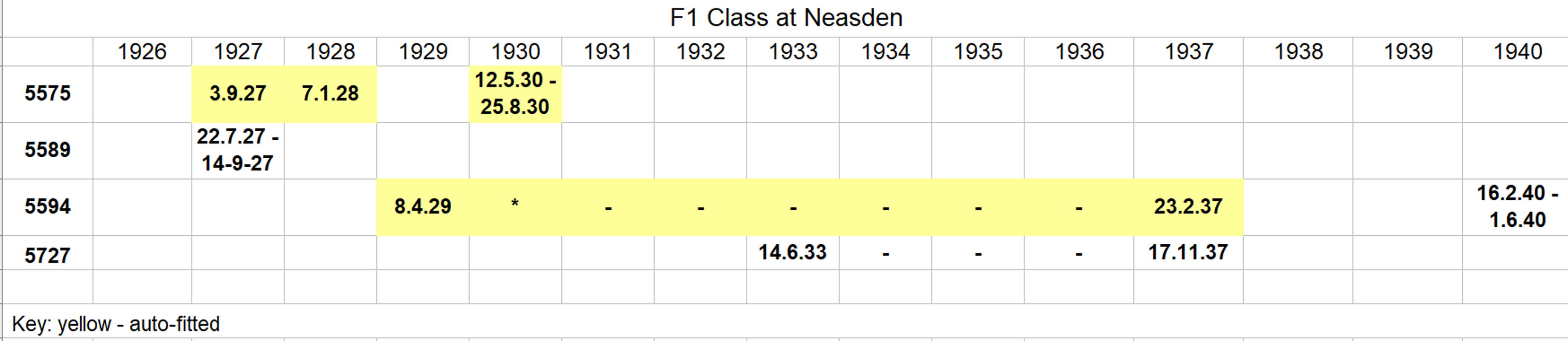 During LNER days a small number of F1s was allocated to Neasden but little has been recorded about why? The picture is complicated by allocation of normal F1s and those equipped for push & pull working, commonly called "auto fitted" which I have highlighted in yellow in the spreadsheet below: