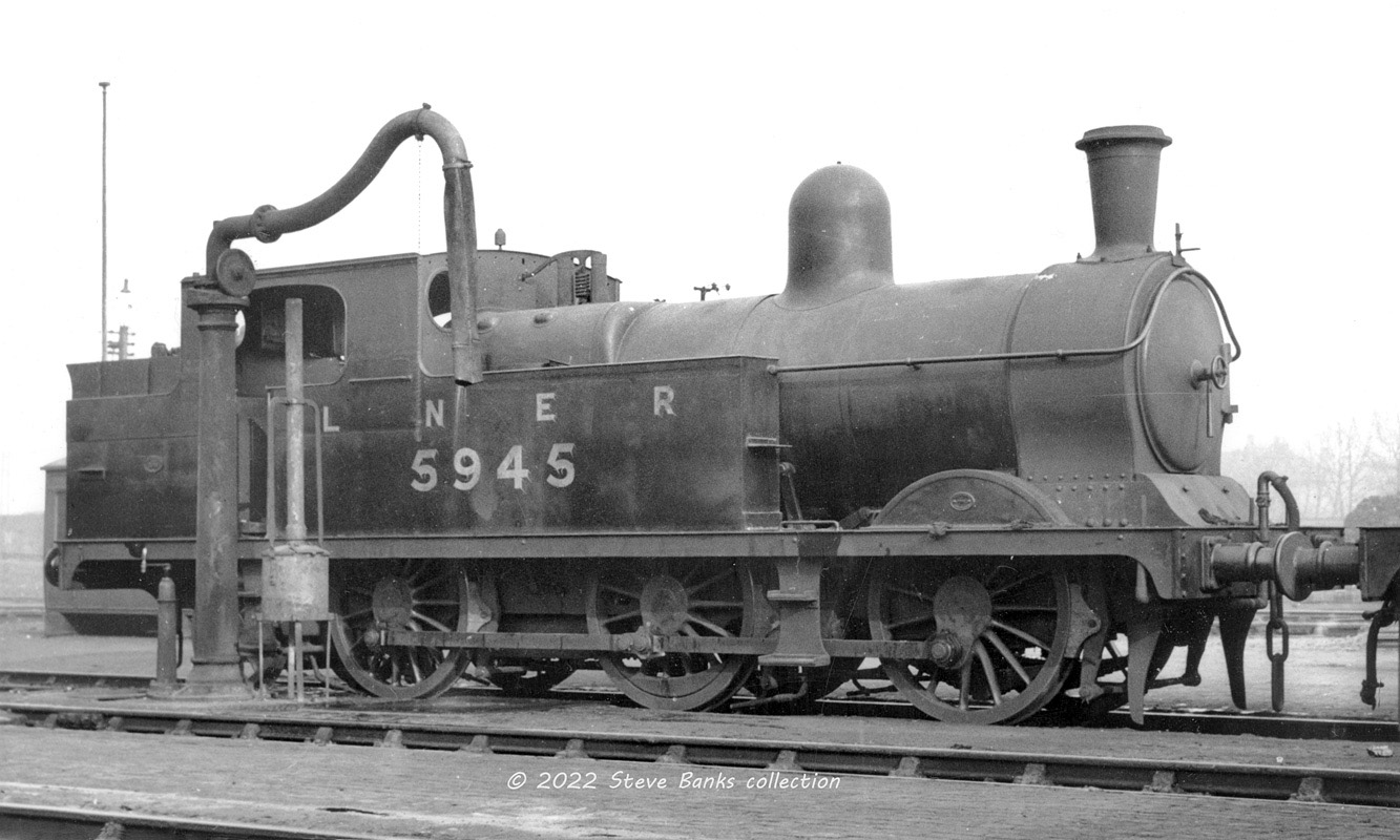 Another of Neasden's N5s, No 5945, was photographed in 1937, now carrying the final version of chimney, unglamorously nicknamed the "flowerpot" style. In the background, carrying the same style is a J10. It is sometimes thought that only modern GCR designs were deployed on the London Extension but that was clearly not the case. Photo: Les Hanson.