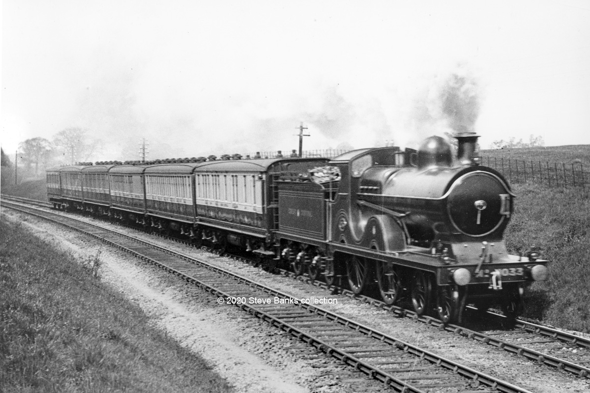 In another scene near Northwood a few years later which can be dated to on or after 1903 and a heavier Up express, possibly from Manchester, is approaching with a tidy 5-set with a restaurant car and a 6w strengthener on the rear. From this angle it is hard to distinguish between types and as far as I can tell, there is a 45'9"1st Class brake behind the tender while the second carriage may be a 46'6" TK or a 50' FK to Diagram 5Q3 or 5Q4. Then comes the 3rd restaurant. Photo: Author's collection.