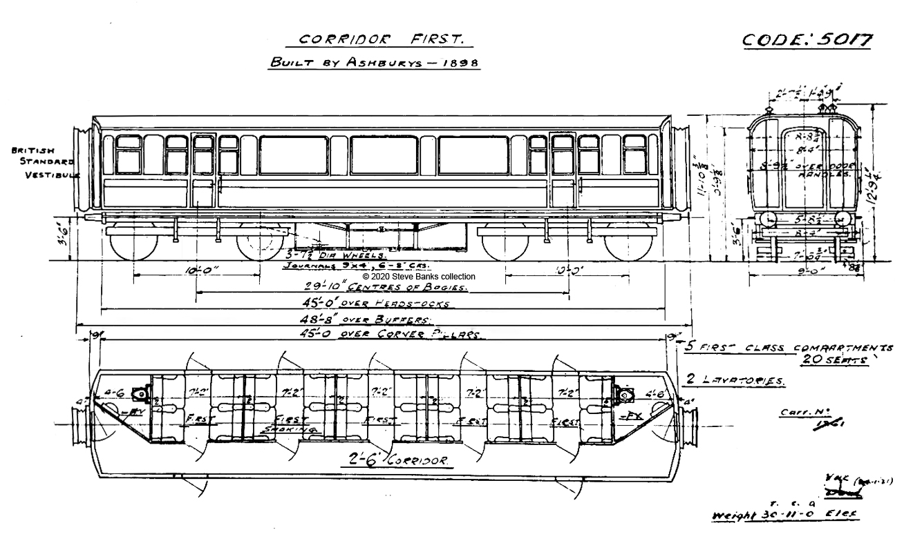 Livery - the Parker stock was painted brown & French grey, which began to be replaced from 1903 by brown & cream. In 1908 there was a switch to a varnished livery after which previously built stock was stripped, rubbed down and varnished. There is some debate as to whether the panelling of the painted carriages had employed mahogany (which takes paint well) rather than teak (which being more oily, does not). If mahogany had been used then the subsequently varnished livery would have stood out from the next generation of varnished teak carriages. A difference can sometimes be seen in b&w photographs and an observer from the 1930s commented on it to me but I have no further evidence myself.