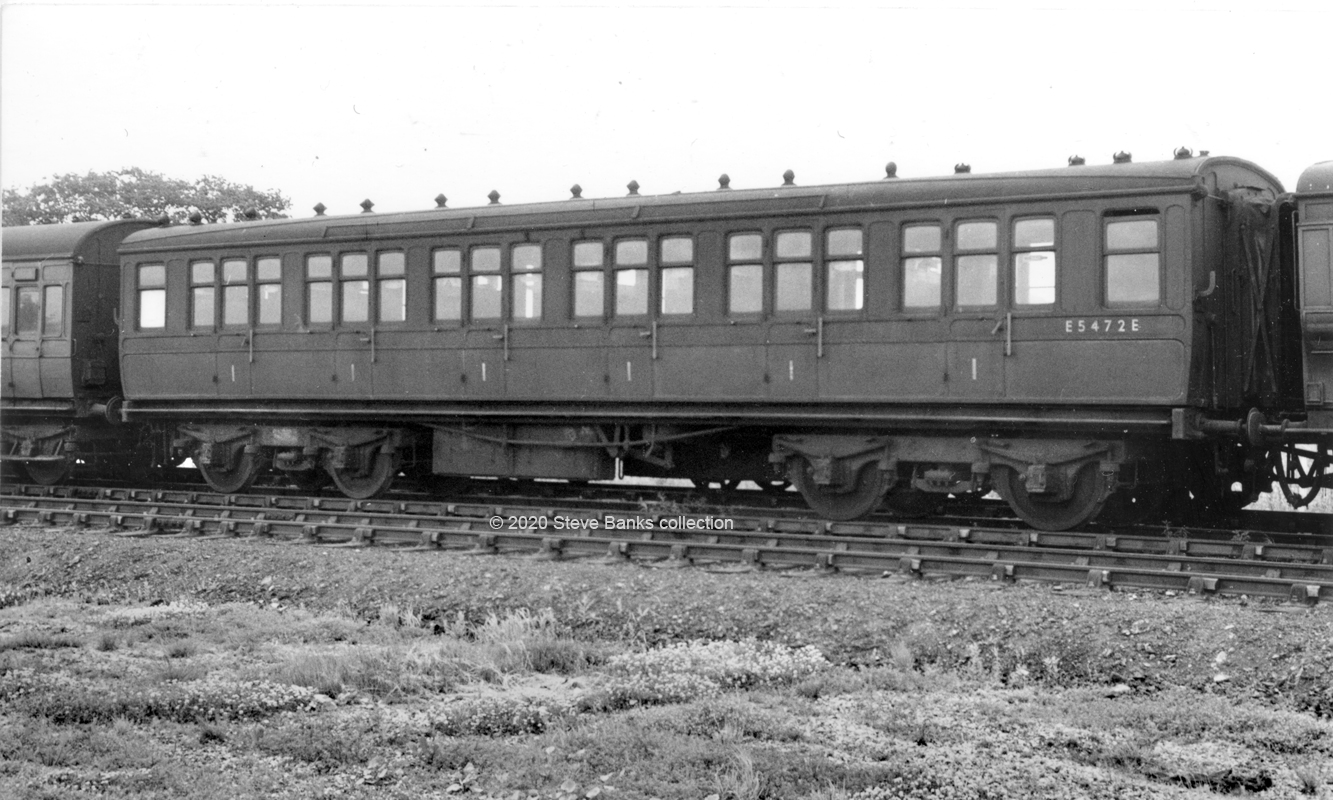 The same Diagram seen at Harlow on July 1955 is E5472E from the compartment side. The livery may be plain brown. Side doors to every compartment were to be a staple on Britain's railways for a long time and inevitably looked more utilitarian and less glamorous than the corridor side. Nevertheless, the pocket size of all-1st carriages like these gave them a long life and as this picture shows, many lasted well into BR days, the last one not being withdrawn until 1956. Such stock was often retained in excursion traffic whether for 1st or lower Class passengers. Photo: Lens of Sutton.