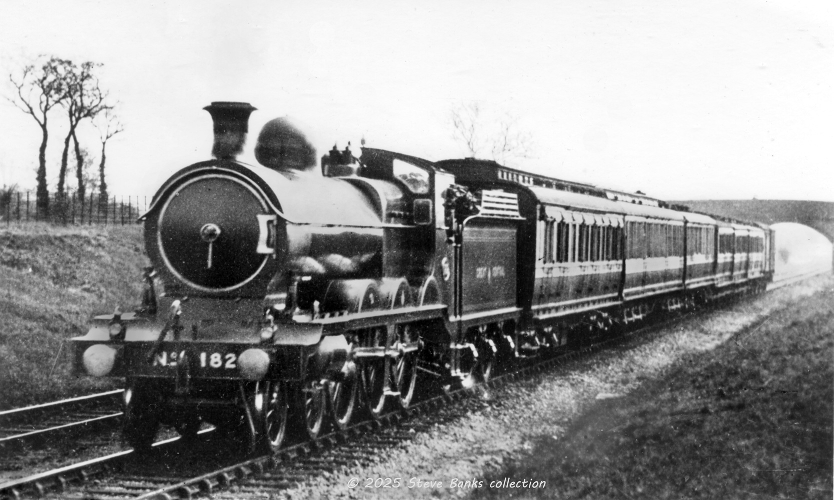 By the time this photograph was taken (possibly 1903) the GCR had acquired these two restaurant cars and this view shows one in a Down express from Marylebone on an unknown date and unknown location. Class 8 (LNER B5) 4-6-0 No 182 is in charge, with the non-standard Metropolitan 3-lamp headcode no longer in use. The photograph is an anonymous copy whose sharpness is not great but I recognise the carriages as a mixture of 1898-99 Parker bogie and 6w carriages, and a Robinson 50' clerestory behind the tender: