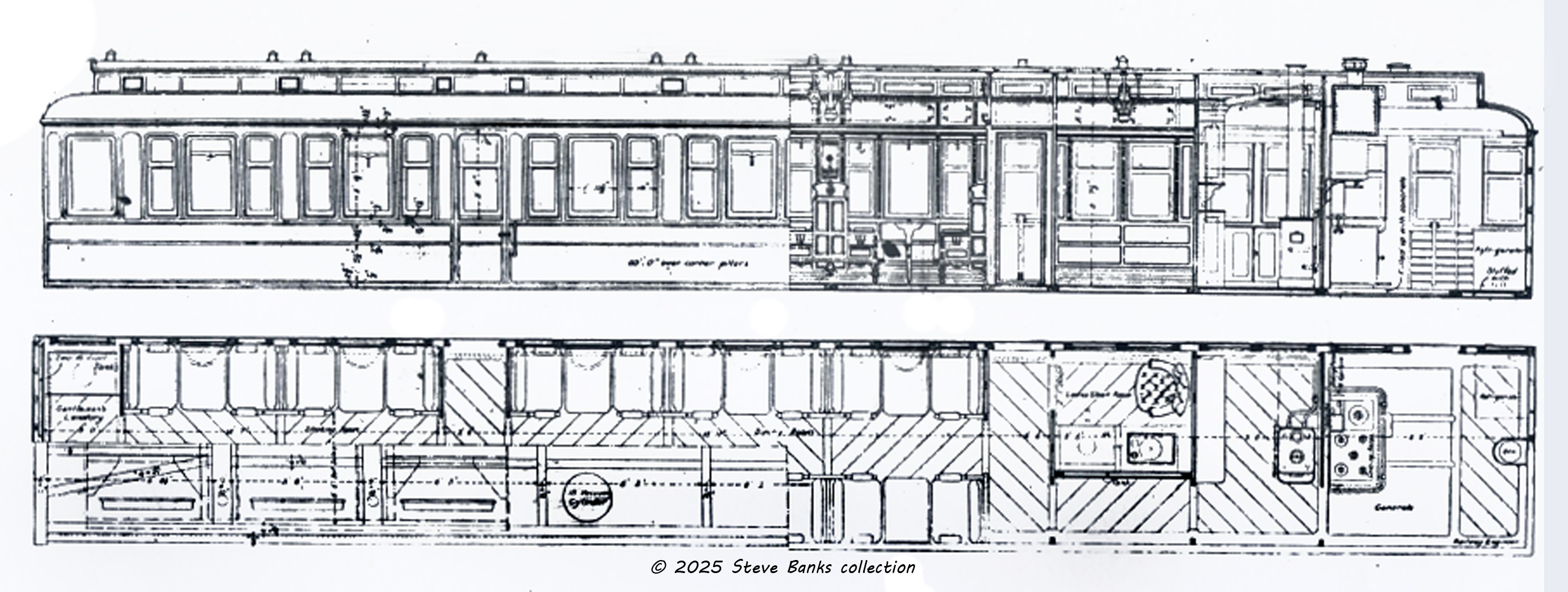 The strengthener behind the tender is a 56' 3rd Open with 48 seats, an early design from 1911. It was unusual and I've put a partly repaired copy of the Diagram below. Photo: W. Leslie Good, author's collection.