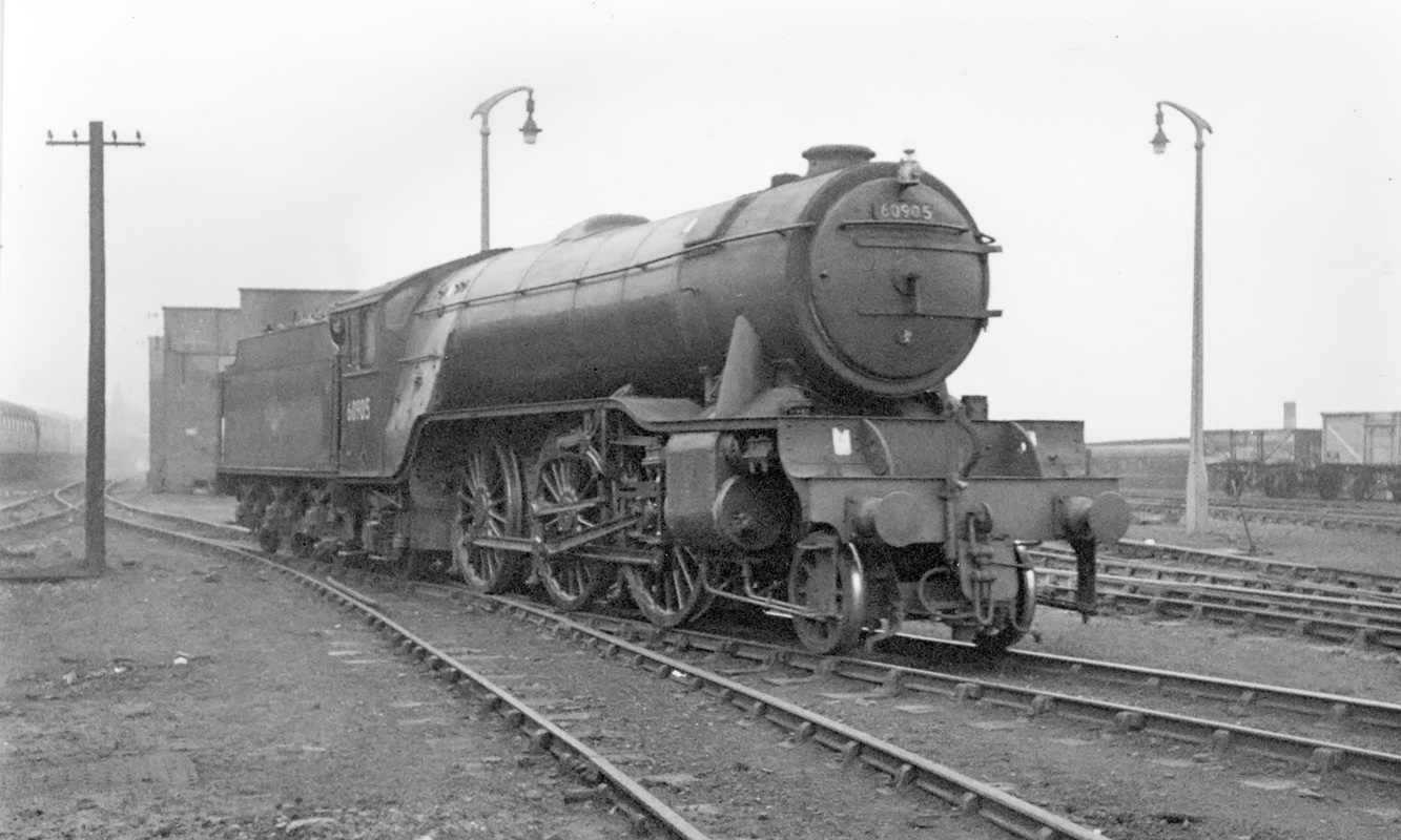 A fairly clean visitor to the shed, a V2 from Doncaster, No 60905. This was probably an action shot of the loco being moved. It's been turned and the tender filled with coal and was either being parked or on its way off shed. I have yet to work out if there was a preferred direction for these moves. Arrivals after turning on the triangle used to arrive on the right hand side of the picture and pass by the south side of the shed and run up to the coaling stage. Departures off shed may have run by this side of the shed but I don't know for sure. Photographer unknown.