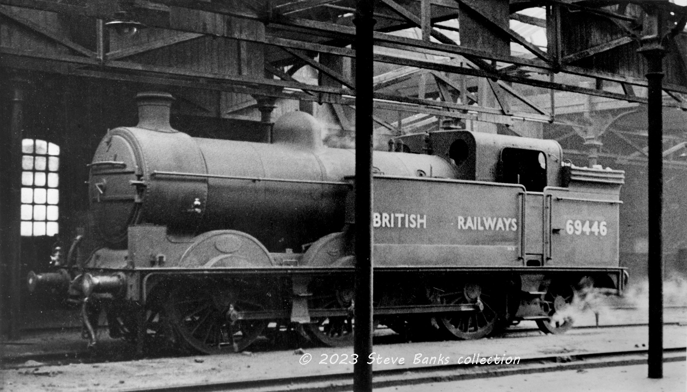 Taken on the same day inside the running shed whose roof is being replaced, N1 No 69446 looks smart in its new BR livery which the records show it had received the previous year. This loco spent its whole life at Copley Hill but when sent to Doncaster works in 1953, it was deemed unfit for repair and was condemned. It proved to be one of the earliest withdrawals of the class and first of the Copley Hill stalwarts to be given up. Photo: George Sankey.