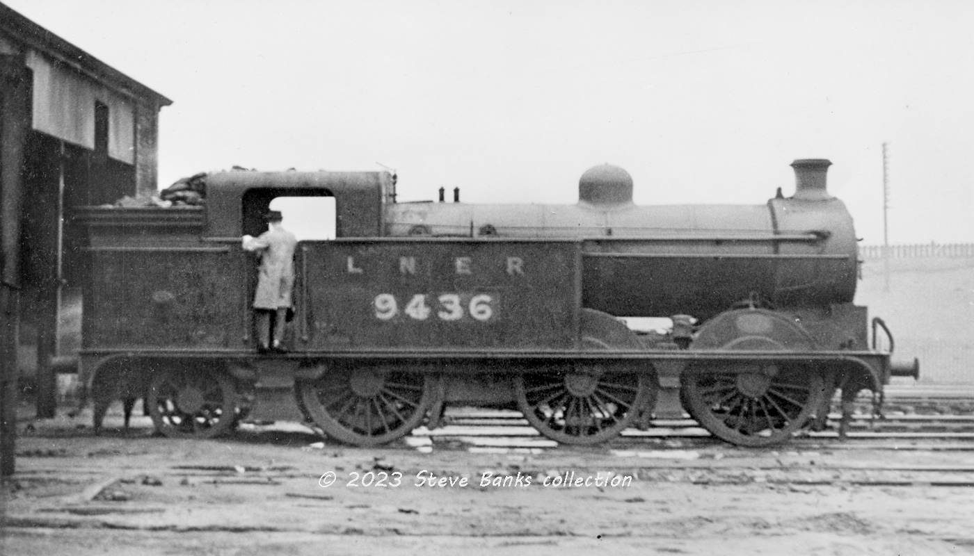 Taken on a murky day on 25th September 1949, when this N1 was carrying its Thompson No 9436 at the east end of the running shed with a member of staff climbing into the cab. This N1 had been at Copley Hill from GNR days and was not to leave until 1954, when it was transferred to Bradford and condemned a year later. As far as I can tell, it spent its entire working life hauling local trains in the Leeds & Bradford conurbation. The photographer wrote "awaiting works" on the back of the print, the records showing that it eventually completed a general overhaul in January the following year. Photo: George Sankey.