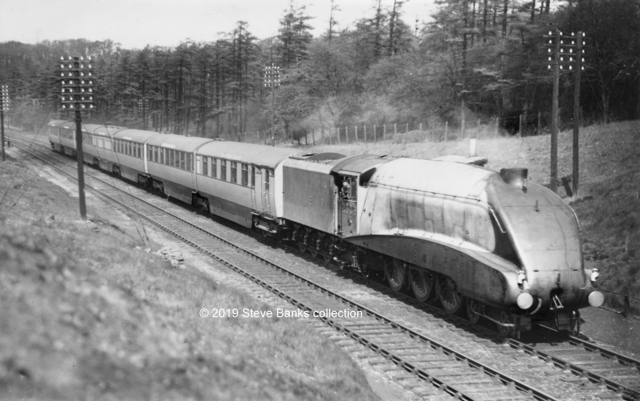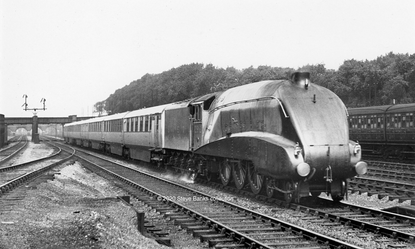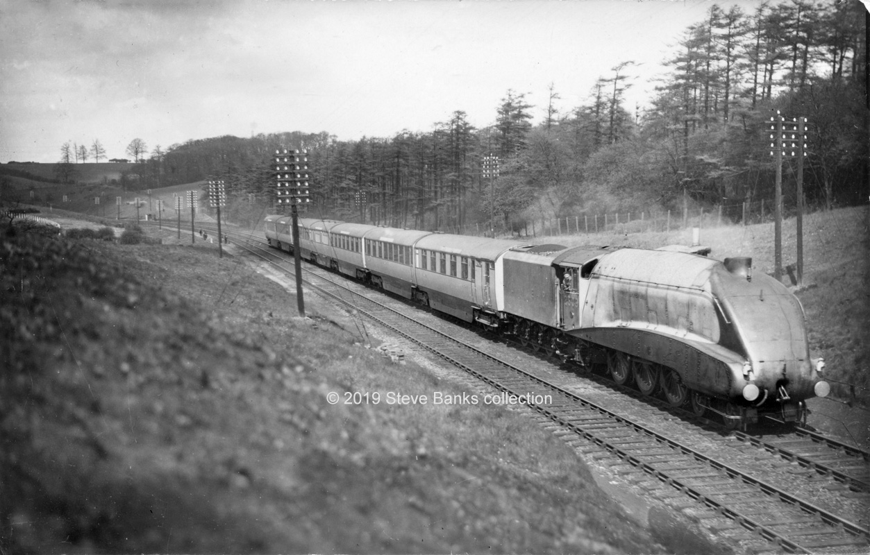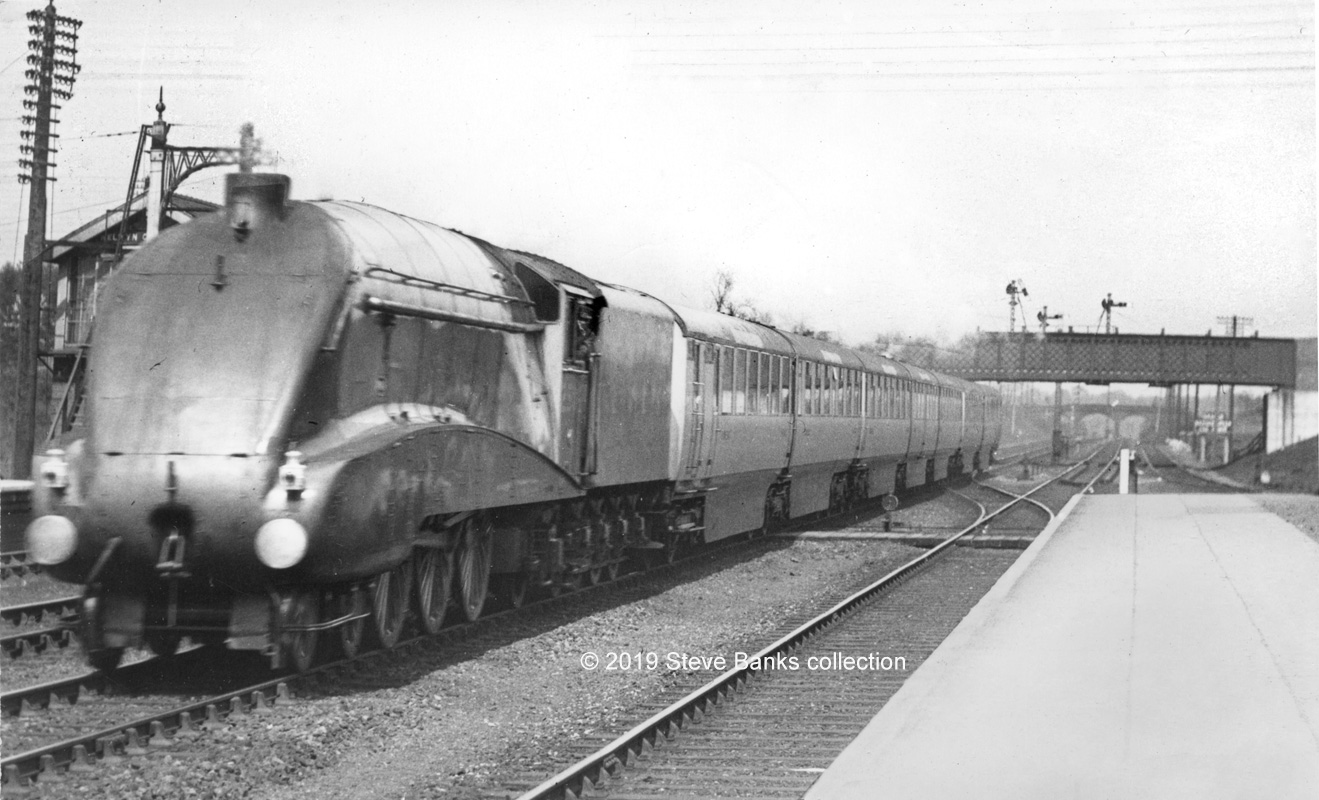 In this view the A4 in charge was built in bue in 1937: No 4492 Dominion of New Zealand and is seen at Harringay in 1938. Photo: G.R. Griggs, c/o Colling Turner, later Photomatic.
