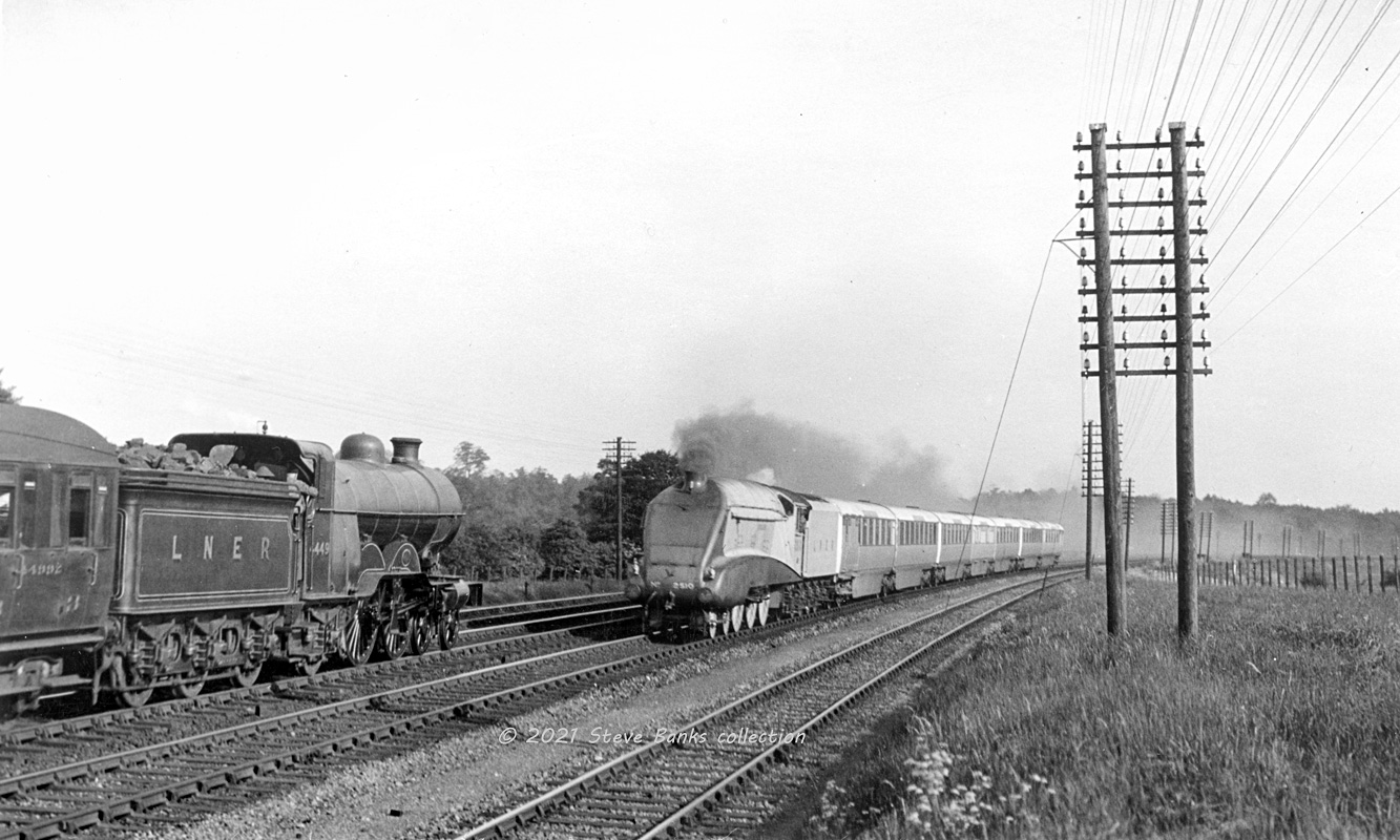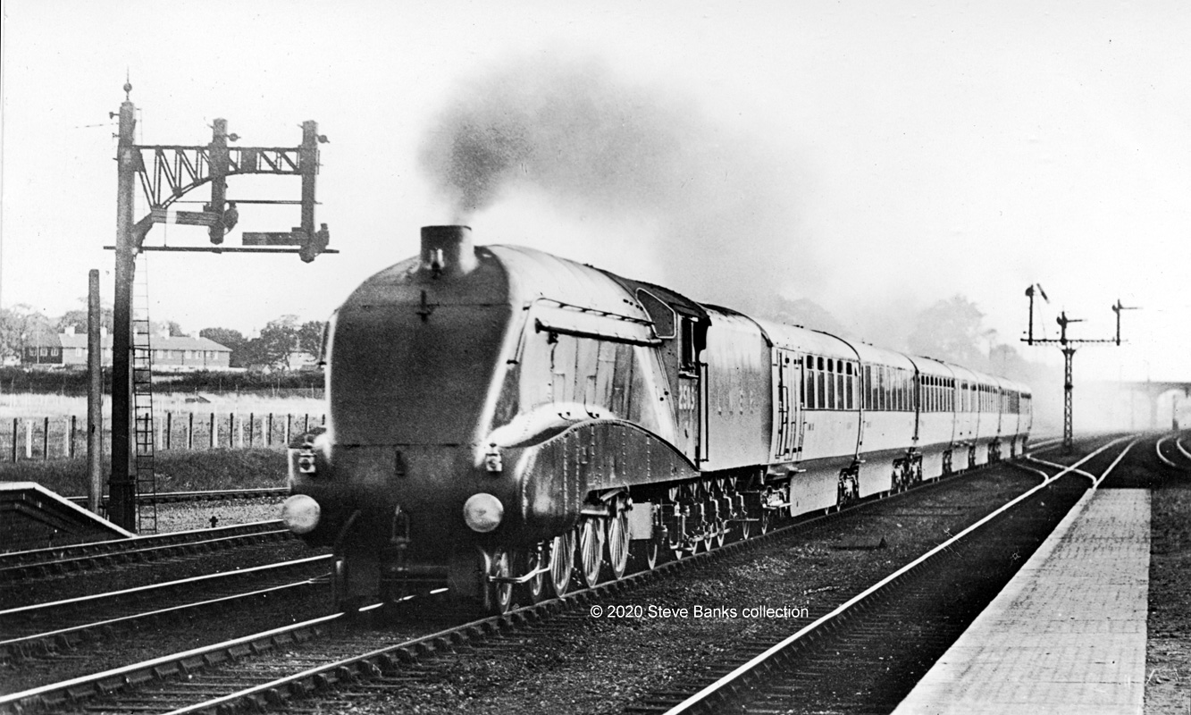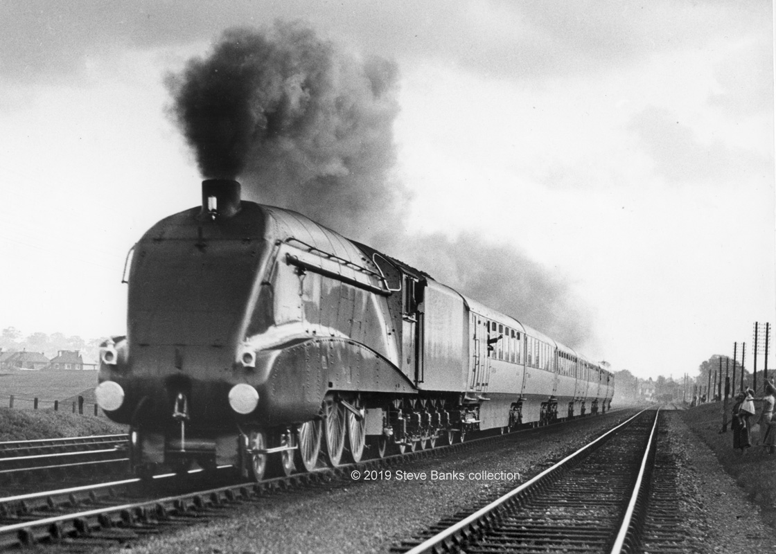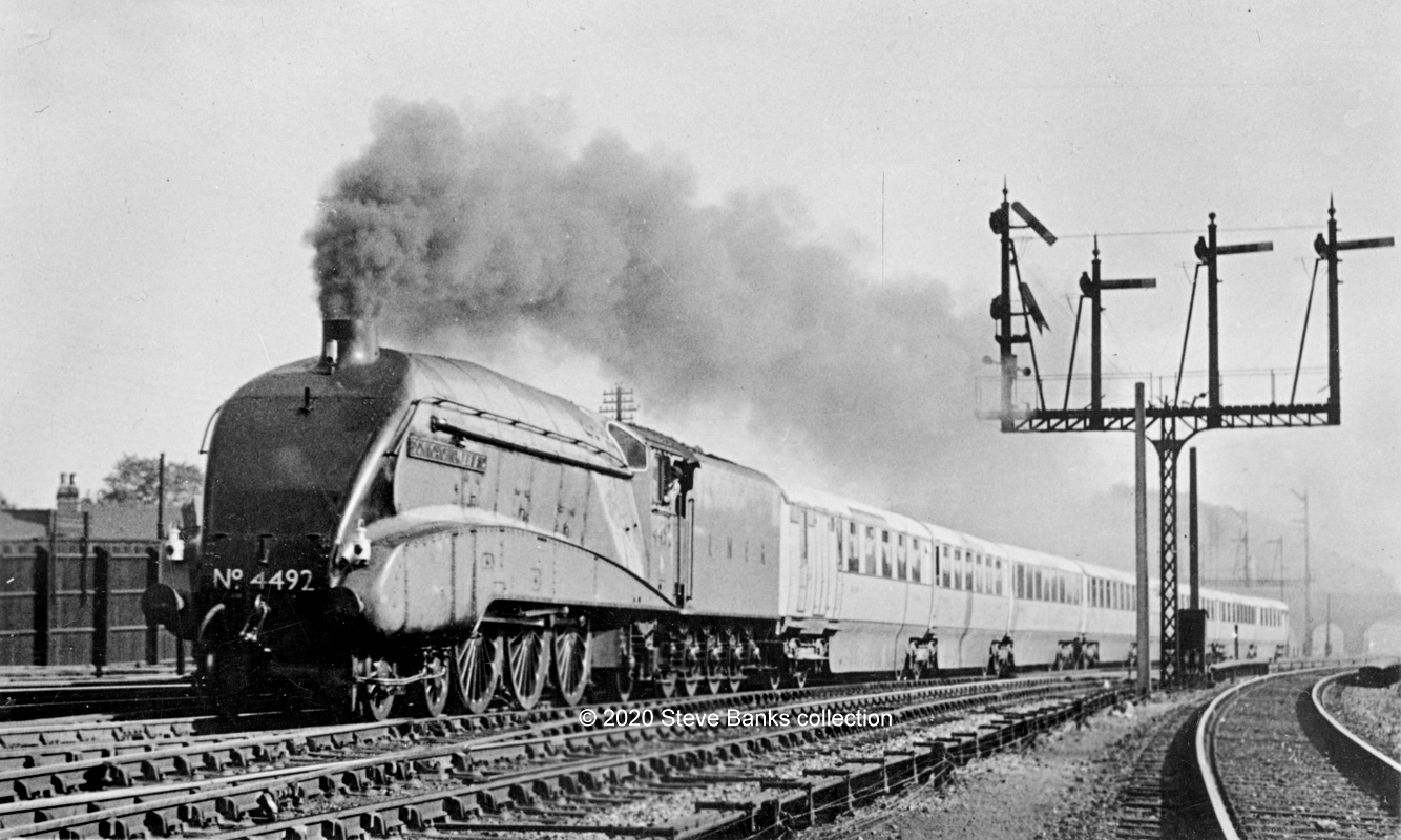 In this view the A4 in charge was built in bue in 1937: No 4492 Dominion of New Zealand and is seen at Harringay in 1938. Photo: G.R. Griggs, c/o Colling Turner, later Photomatic.