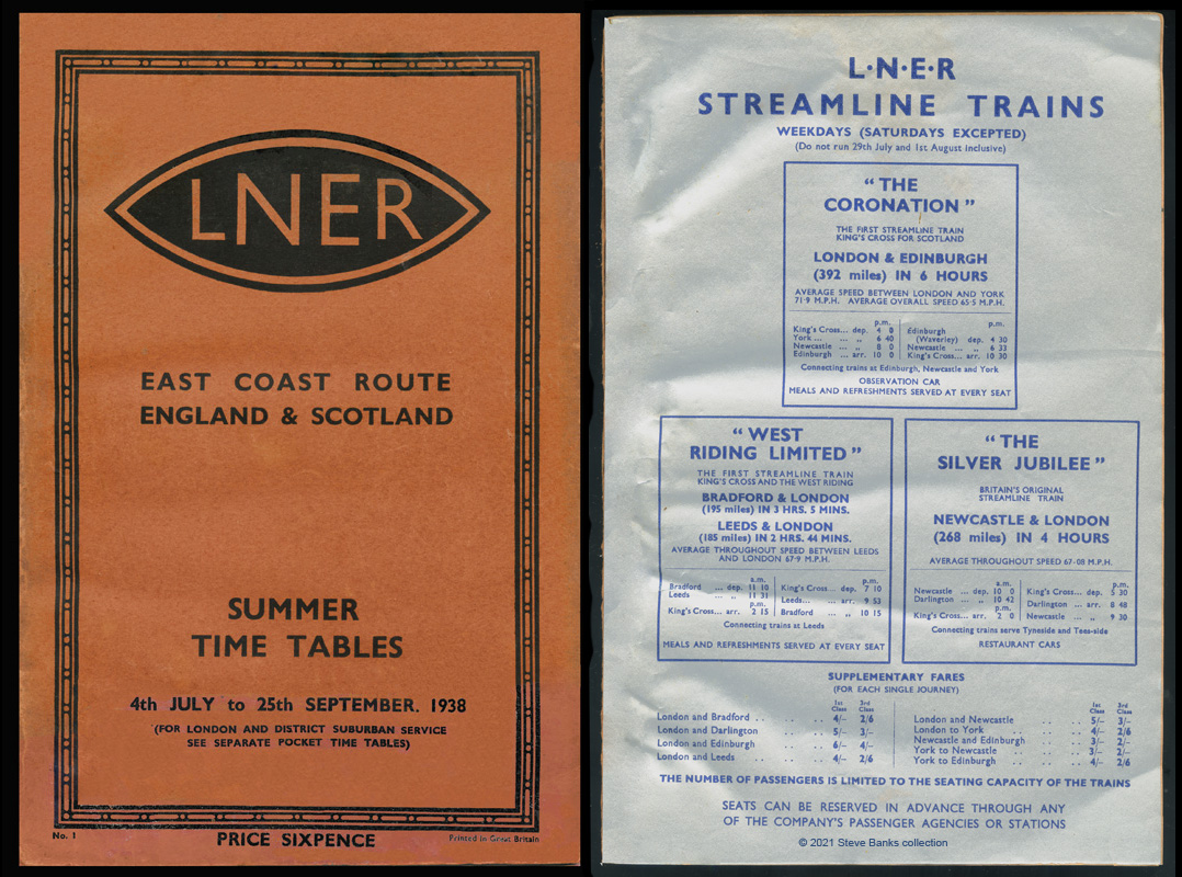 When the Streamline trains were introduced you might have thought that they hardly needed advertising. Yet a new page was inserted in the public time tables for the East Coast Route, England and Scotland, and it was the first page you saw as you opened it - and on glittering silver foil (which a scanner barely does justice to). The 1936 edition was titled THE SILVER JUBILEE.