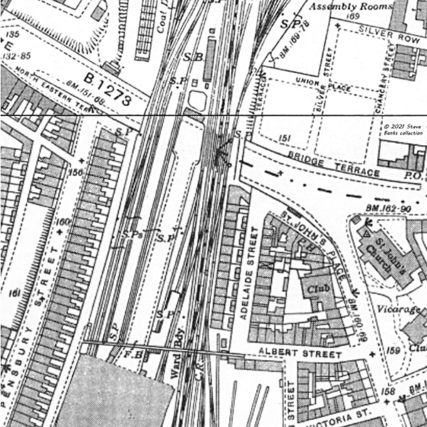 The train is almost dead centre on the map with a fragment of the signal box visible on the left (marked "S.B.") and the back of Adelaide Street on the right (they would have been railwaymen's cottages, hence the liberal advertising with enamelled signs on the railway side). The train is about to cross over from the Up fast line.to stop at the platform, indeed, the loco's leading wheels have just begun that move. There was no messing about at Darlington where the timetable allowed two minutes for passengers with reserved seats to climb aboard - those without reservations stood little chance of finding a vacant seat - and the train was off again, non-stop all the way to London.