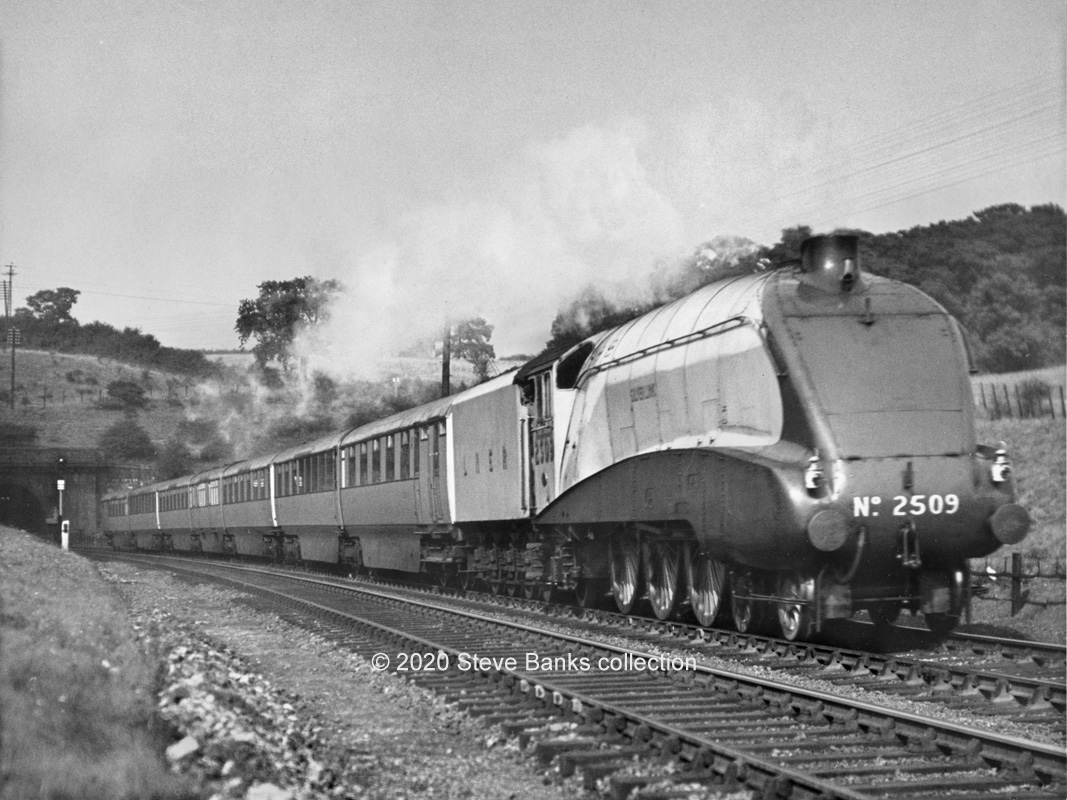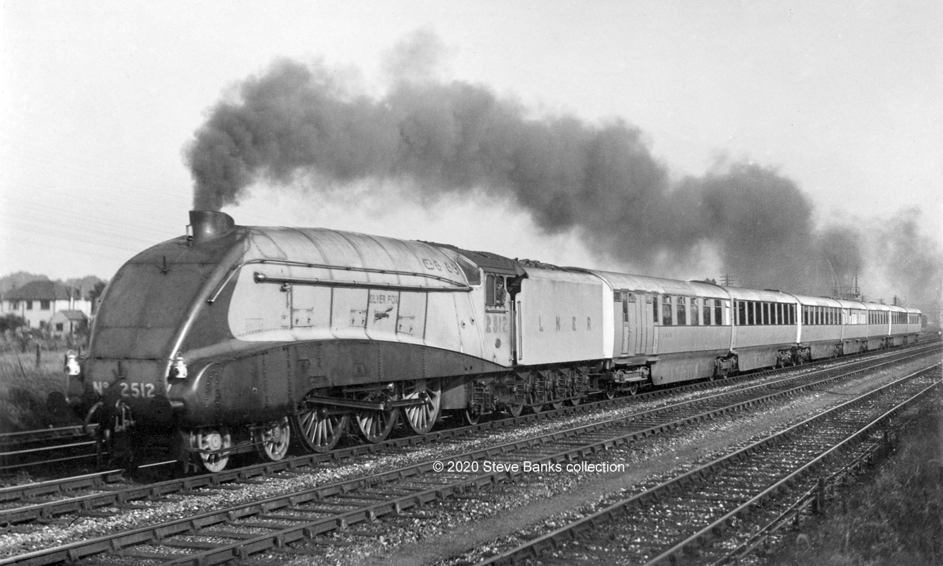 An LNER official view of the new train being delivered by A4 No 2509 Silver Link. I have yet to establish the location except to say that it's on the four-track and the train is carrying ECS lights and may have been posed. So many steam-era pictures were adjusted and in this case the upper cab was burned in to conceal the driver leaning out of the cab. I have tried to correct the worst of this but the man remains an unidentifiable black shape. Photo: author's collection, LNER TS 29.