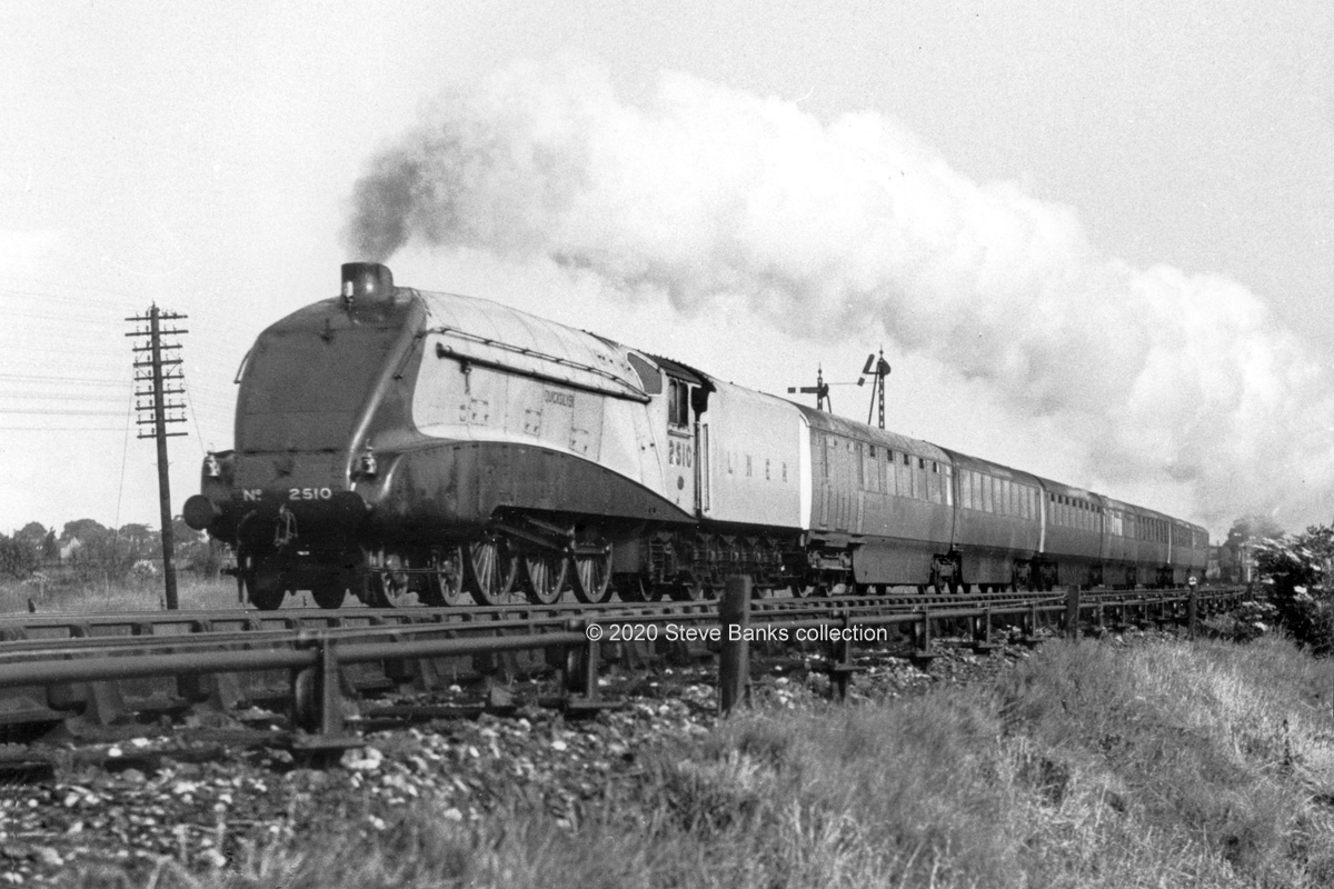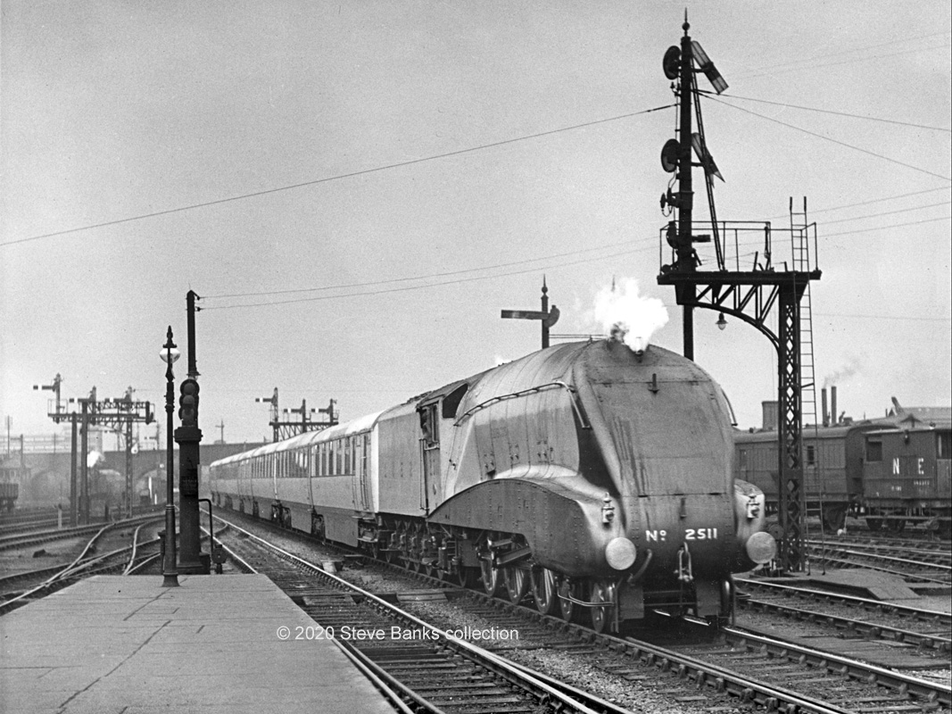 A rare view of the A4 allocated to Gateshead, No. 2511 Silver King, deputising for a King's Cross loco on the Up train, passing Peterborough North. There's either a leak or the chime whistle is being blown. Photo: T.G. Hepburn, Rail Archive Stephenson.