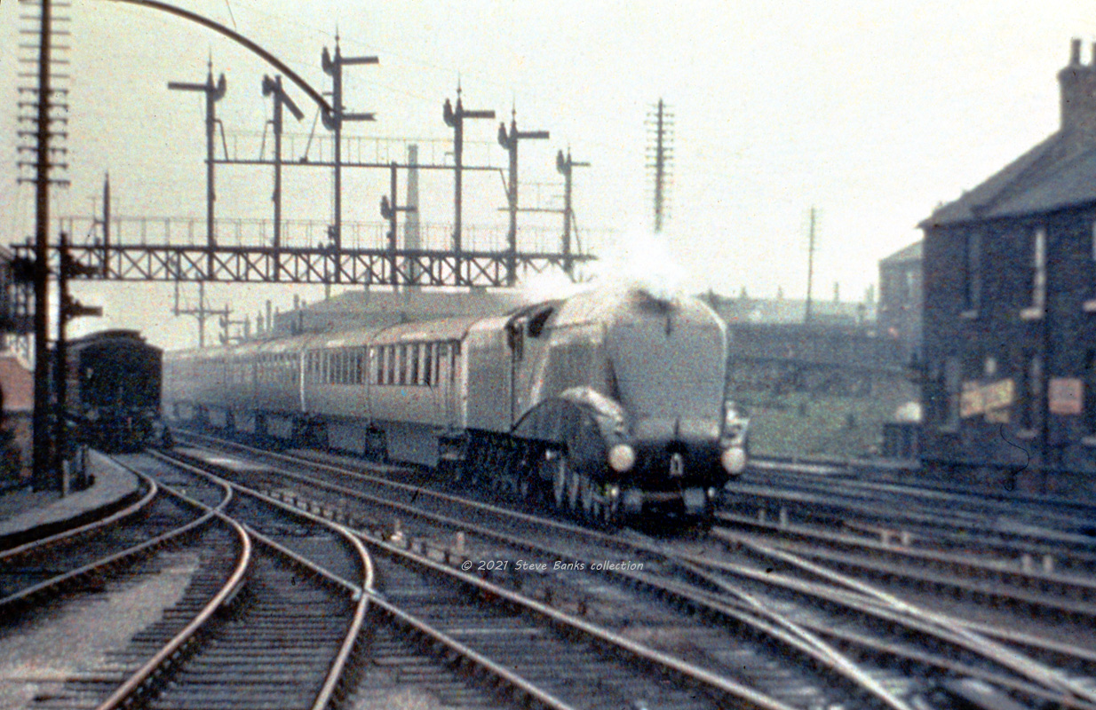 The slide is quite yellow and vignetted, which I have tried to repair, and shows the Up train in the morning at around 10.40am (it called at Darlington) with a faint gleam of autumnal sunlight on it. There are sharper views in b&w but this captures the essence of the new train in its north-eastern context. The buildings are smoke-laden, an ex-NER clerestory carriage can be seen alongside, possibly a departing secondary service, and an ex-NER signal gantry with slotted posts. I may be wrong but I think the whistle is being blown to herald its arrival and as many people know, the three-note chime once heard is unforgettable. Note by the way that this named express never carried a headboard on the loco: there was no need! Colour-Rail NE.99.
