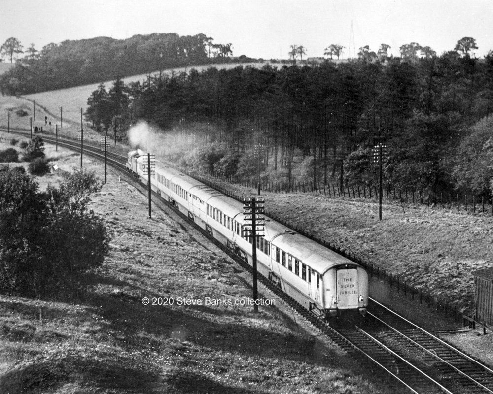 The Up "Silver Jubilee" in July 1936 behind A4 No 2509 Silver Link was captured at Ganwick by H. Gordon Tidey and this is his signed print. It's a landscape style view that was rare at the time and the silver train not only contrasts with the British countryside but its relatively short length may just be detected. The photographer may have tried to show this deliberately for pictures taken here of the Flying Scotsman with 15 carriages show a train stretching far back along the curve in the distance! Photo: H. Gordon Tidey.