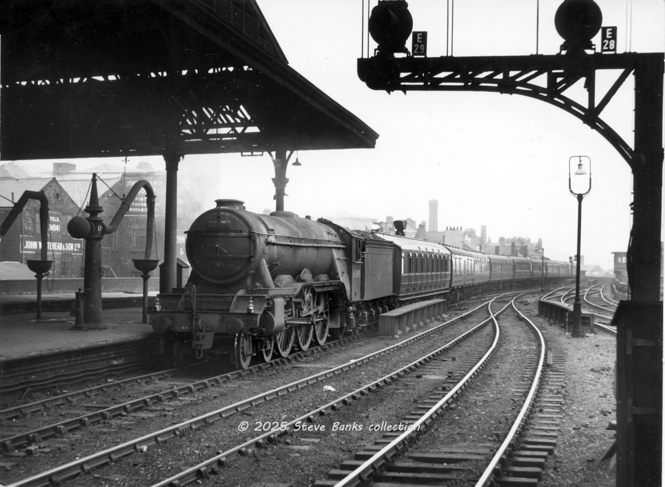 "1955" has been added in a different hand on the back but the loco livery is post-1957 and it's after Neville Hill gained ex-LMS Ivatt 2-6-2Ts to serve as station pilots in 1958. The Pacific was a Heaton loco until February 1960 so a reasonable date for the photograph would be 1958-59. The sun angle tallies with the 11am Liverpool-Newcastle about to take the "Leeds Northern" route. Photo: RK Blencowe Negative Archive.
