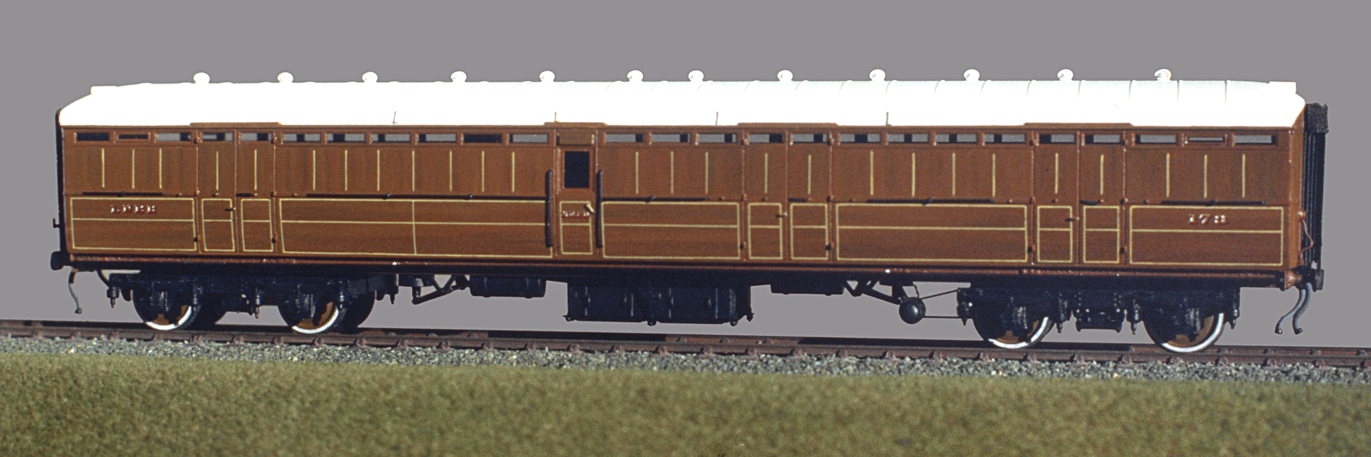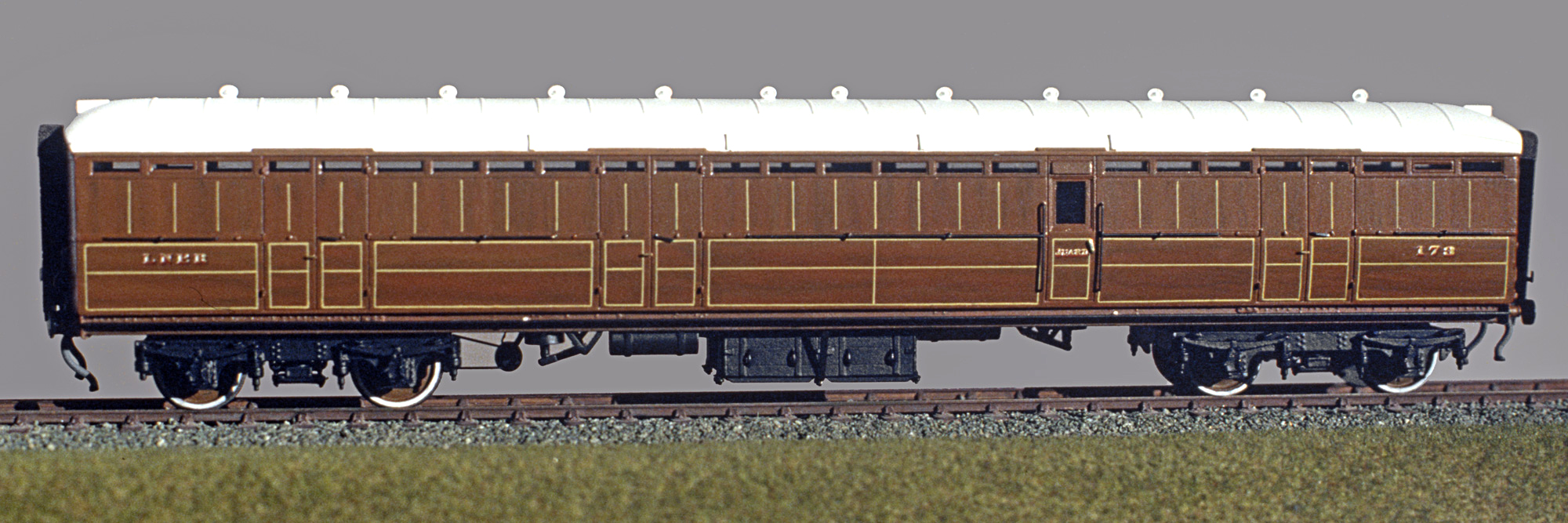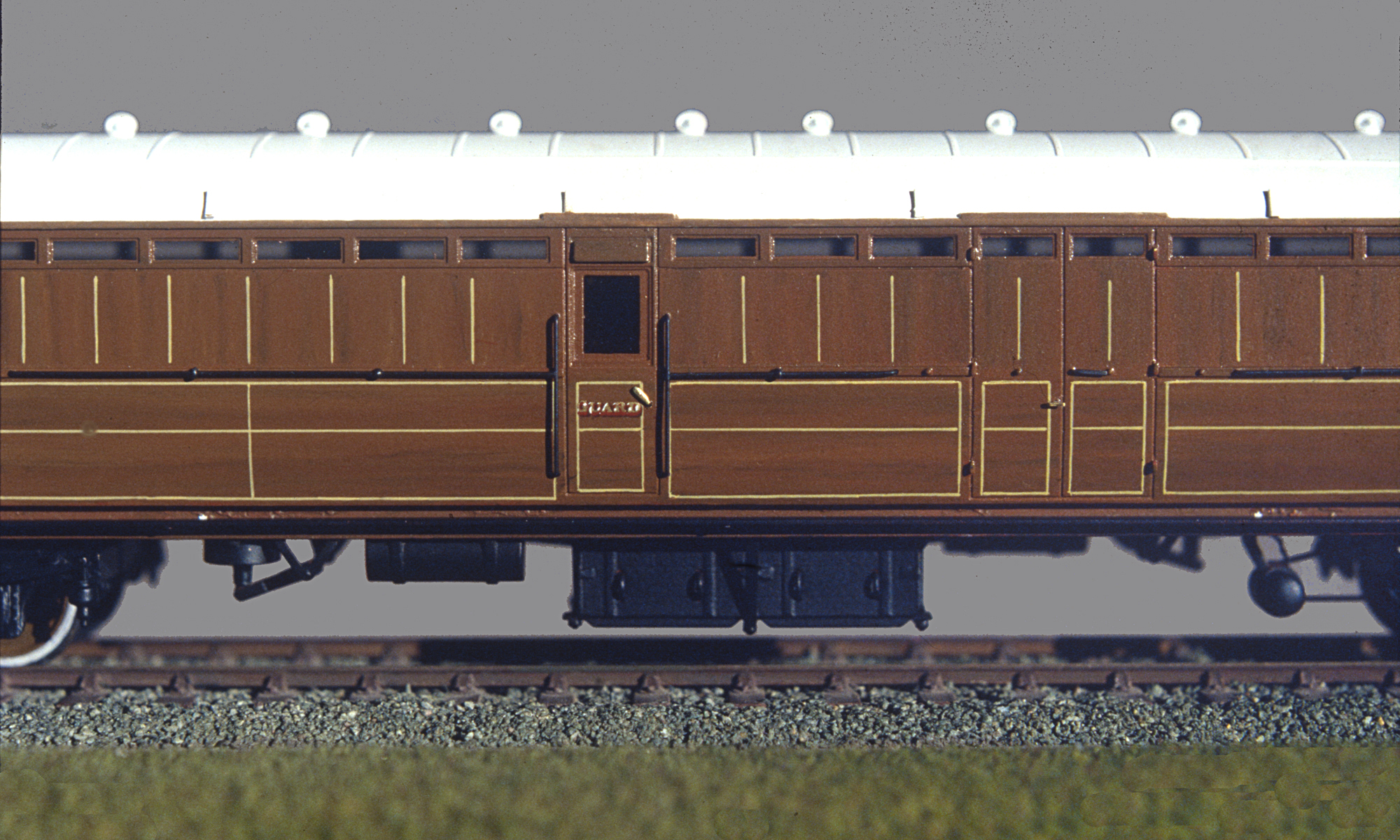 The view from the other side, with a little reflected light to show the steel body sides. I didn't want to overdo this and the model is best seen in the flesh: it runs in the "Flying Scotsman" on Cliff's The Gresley Beat, where it really stands out compared with the panelled stock in the rest of the train. Also noticeable is the roof which looks a bit like a boiler! I used the MJT system, adding the "boiler bands" with Microstrip.