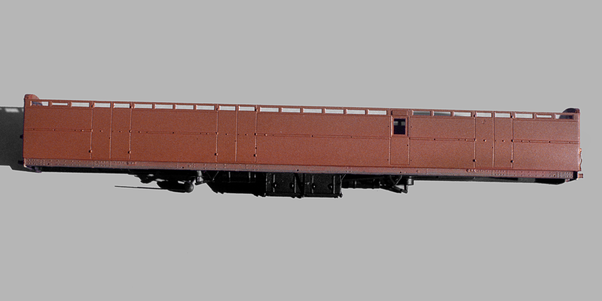 The middle of the model seen from the other side. As always, the guard's door opened inwards, hence no visible hinges (they were internal), and the bottom of the door was higher to clear the interior floor. The long handrails along the waist are prominent.