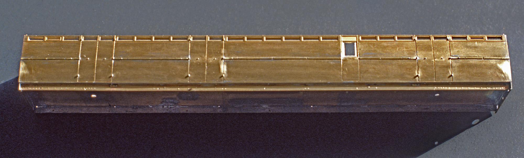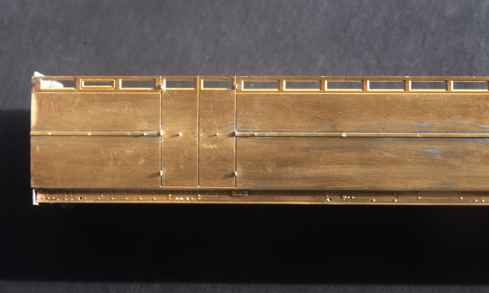 A closer view of an end with the aforementioned holes in the solebar clear to see, and Milliput in the holes along the waist after I had to open up a few. I'd struggled to get them all central and this fix was handy. The lighting is very oblique to show the effect of this strip along the waist (on the prototype it covered the joins between the steel sheets used to make the body).