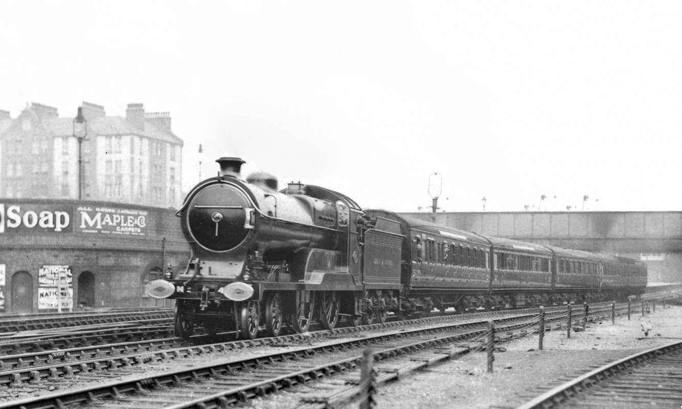 11E (LNER D10) No 430 Purdon Viccars leaves Marylebone with an express for the north. The loco was built in 1913 and I would estimate a pre-Great War date for the picture, with recently built matchboard stock. The formation comprises 5 carriages with no through brake composite nor any strengtheners and may have been a weekdays or off-peak service for Manchester. Photo: C. Golder collection.