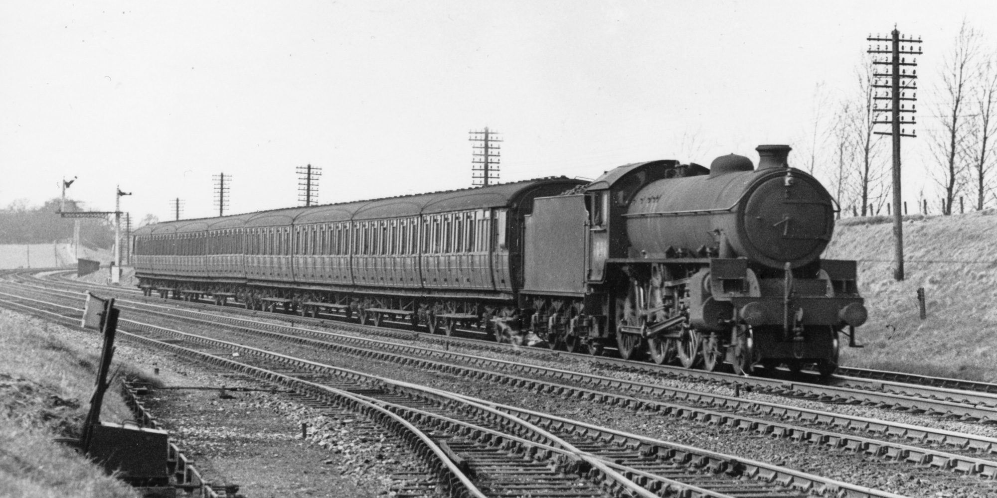 In this post-War scene from 1946, N2 2674 is near Hadley Wood with an LNER-built "quad-art" train coming out of the sun. The set number, 93, can just be made out on the end carriage. With apologies for the mucky state of the picture - AG Ellis copied many pictures with, it has to be said, varying degrees of success. Photo: AG Ellis