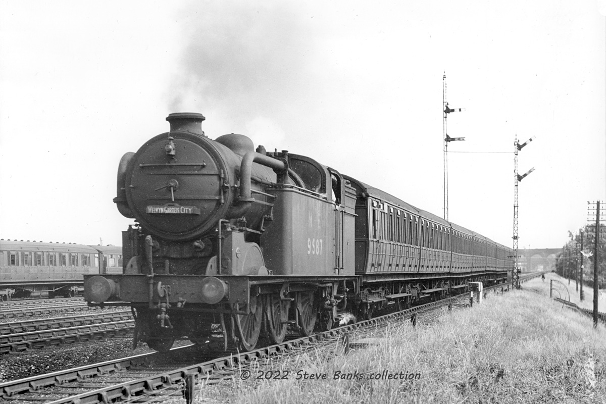 A slightly earlier view on 5th July 1947 also near New Southgate with an Inner Suburban train for Welwyn Garden City. N2 No 9587 has a 3rd series "quad-art" set on Gresley heavy bogies. This time the signals can be seen! Photo: E.R.Wethersett.