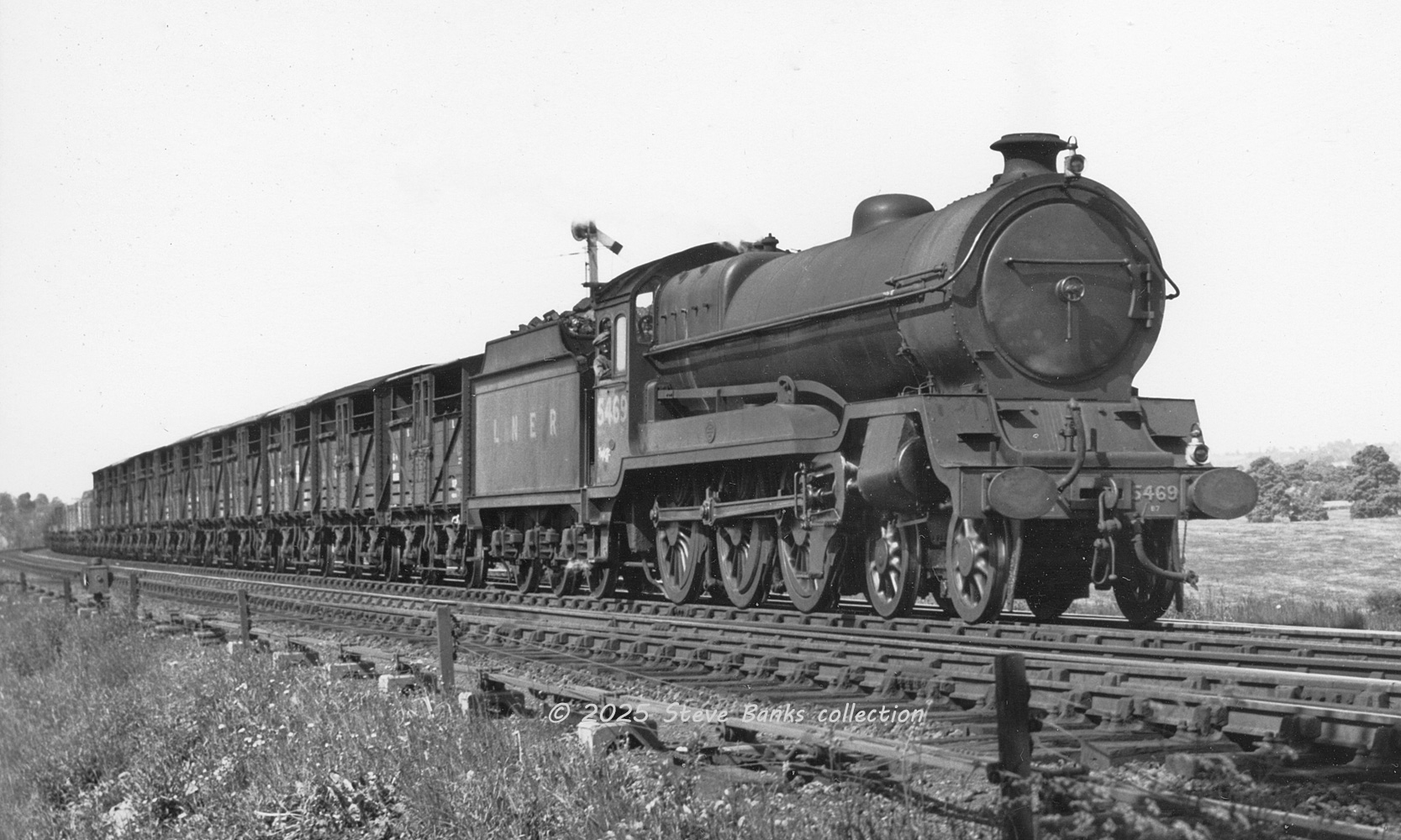 This is a large print but, alas, not very sharp, dated 1959 and showing V2 No 60854 (KX) at Eryholme on the ECML a few miles south of Darlington with a fully fitted express freight. Behind the tender is a pair of cattle wagons: