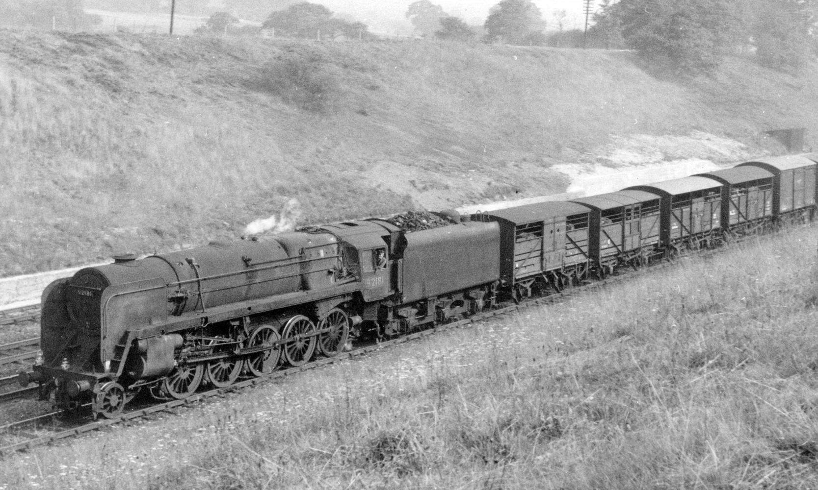 It's 1961 and 9F No 92181 has a fully fitted down freight near Potters Bar with four AVB cattle trucks at the head. These are ex-SR, ex-LMS and ex-GWR or BR (with the same caveat about construction in 1949-50). Photo: R.S. Carpenter.