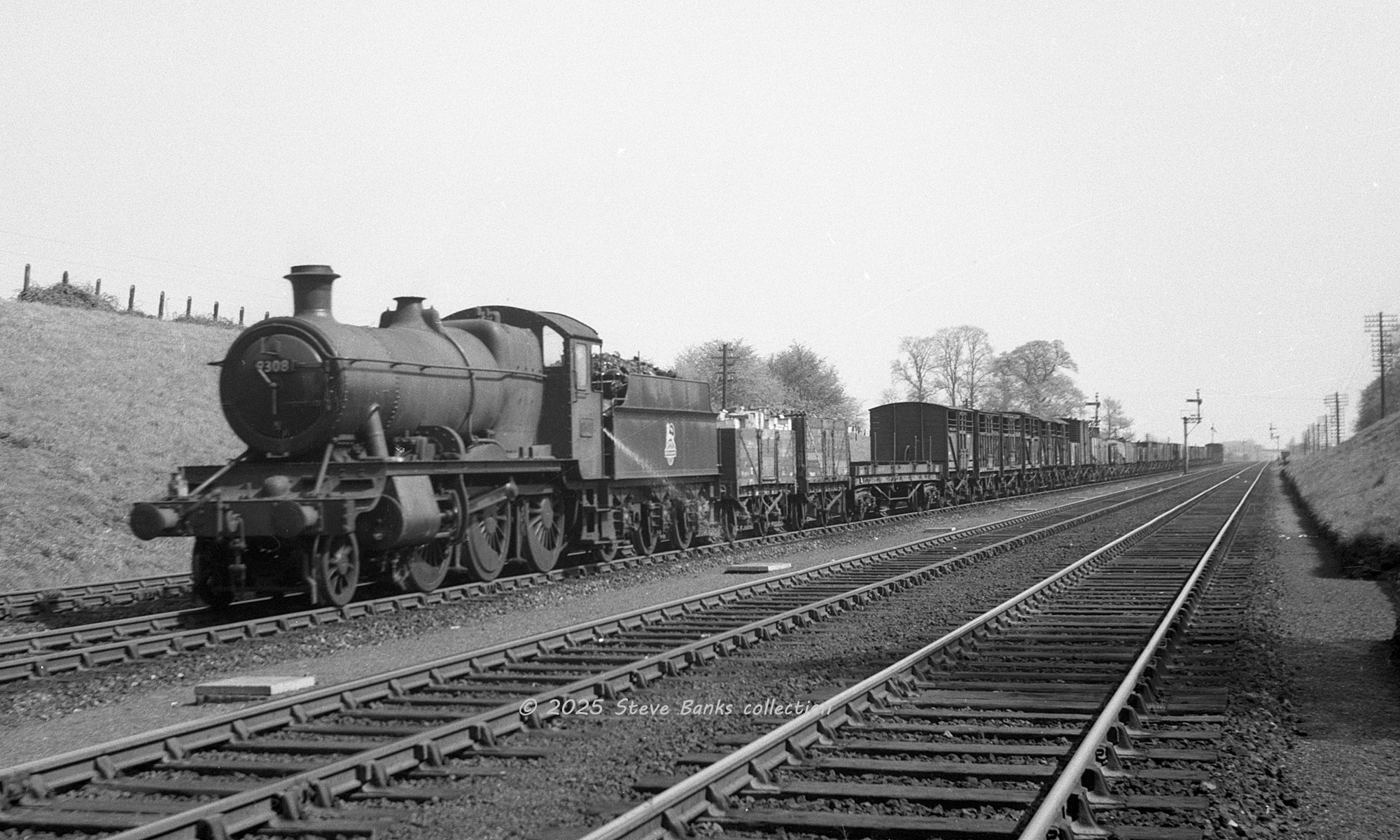 This picture has been dated as 1939 and 1946 and shows ex-GCR B7 No 5469 passing the laybye at Staverton Rd. (the signal box is behind the photographer) with an up Class A through goods for Woodford Halse. The correct date would have been 1939 when the loco was at Annesley (rather than 1949 when it was at Gorton). At the head of the train are 10 GWR cattle trucks probably being taken back to Banbury Cattle market. The wagon liveries are a mixture of the large and the later, smaller letter schemes. Although almost certainly empties, they had been placed behind the loco all the same. Photo: Gordon Coltas.