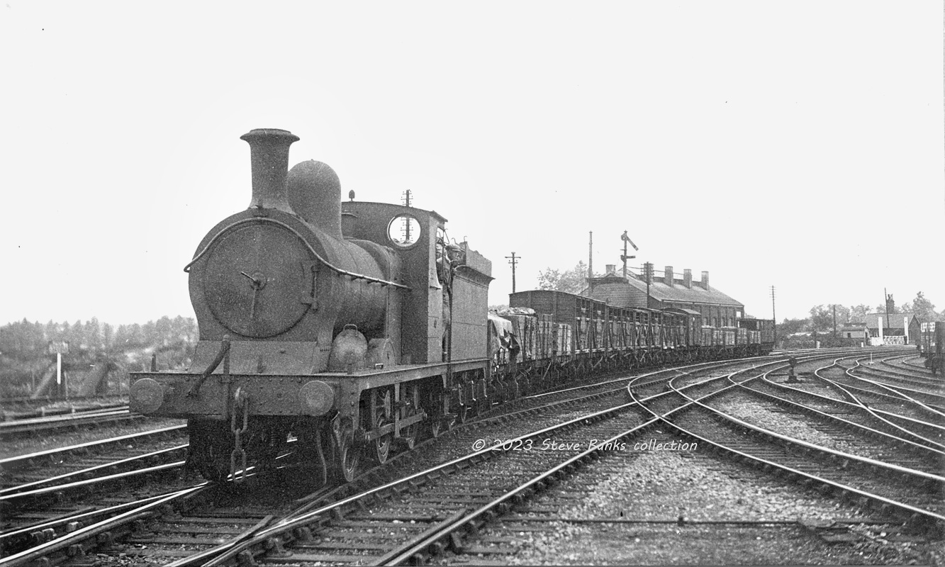 A superb but alas undated picture by H. Gordon Tidey from the period when ex-GCR J10s operated in East Anglia shows No 5805 on a pick-up goods approaching Beccles (with thanks to Geoff Moore - previously miscaptioned "Yarmouth South Town" per the back of the original print, not in Gordon Tidey's hand). Beccles engine shed is in the background with the line from Lowestoft on the right and a glimpse of the substantial exchange yard for lines which met here. This J10 was at Norwich between 1926-30 with an undated blip at Yarmouth and was probably working between Norwich-Beccles, Norwich-Ipswich or Yarmouth South Town-Beccles.