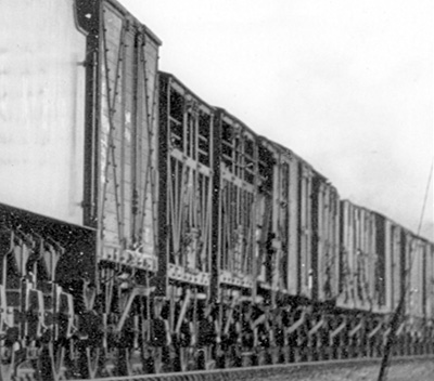 Note the use of limewash as a disinfectant (NOT "whitewash"). This lasted until around 1924 when liquid disinfectant was introduced. Use of lime in cattle trucks was banned formally a few years later but the liquid version (based on phenol, a.k.a. carbolic acid) was adopted quickly because it was so much better. Everybody was really glad to see the back of lime. Photo: Ken Nunn Collection.