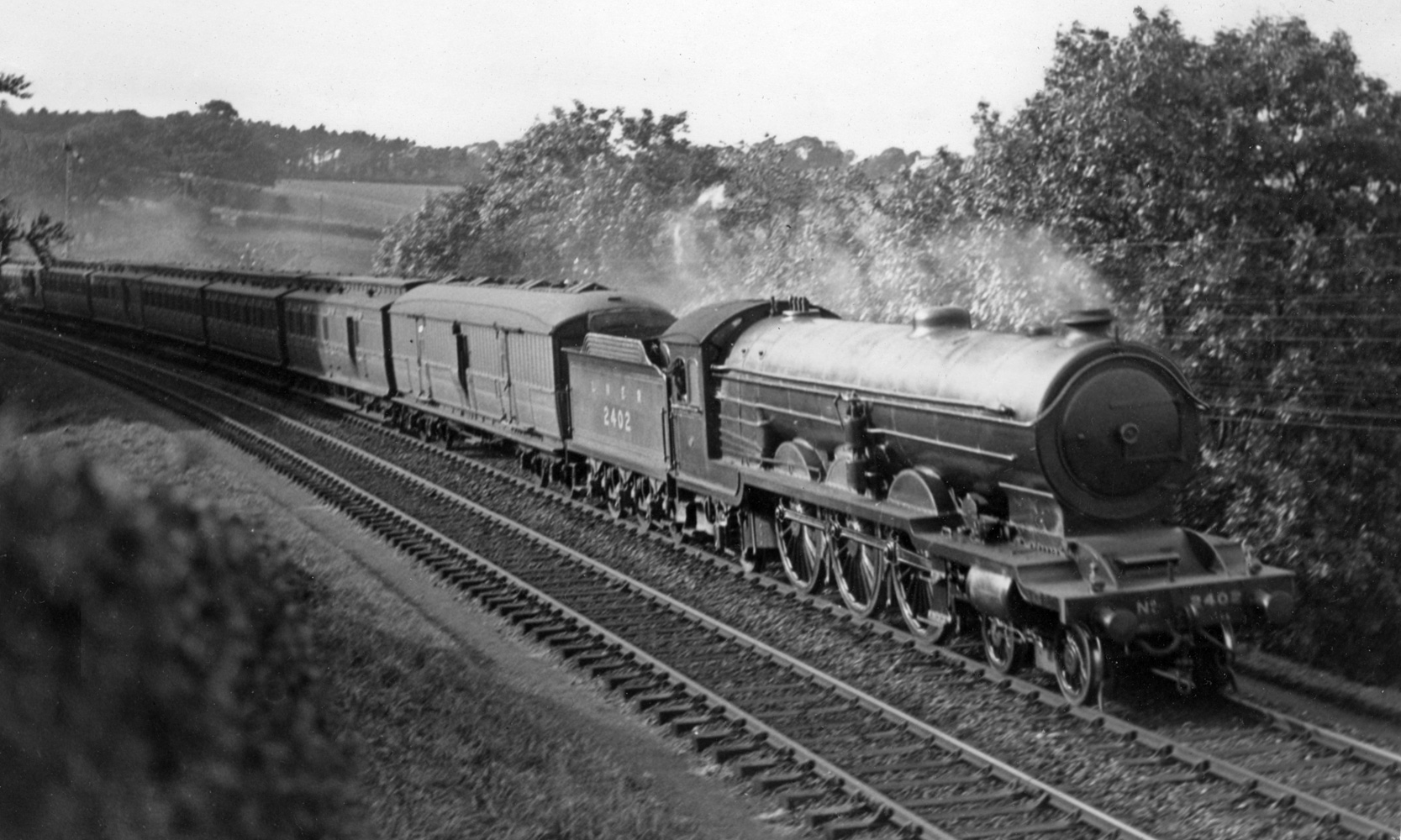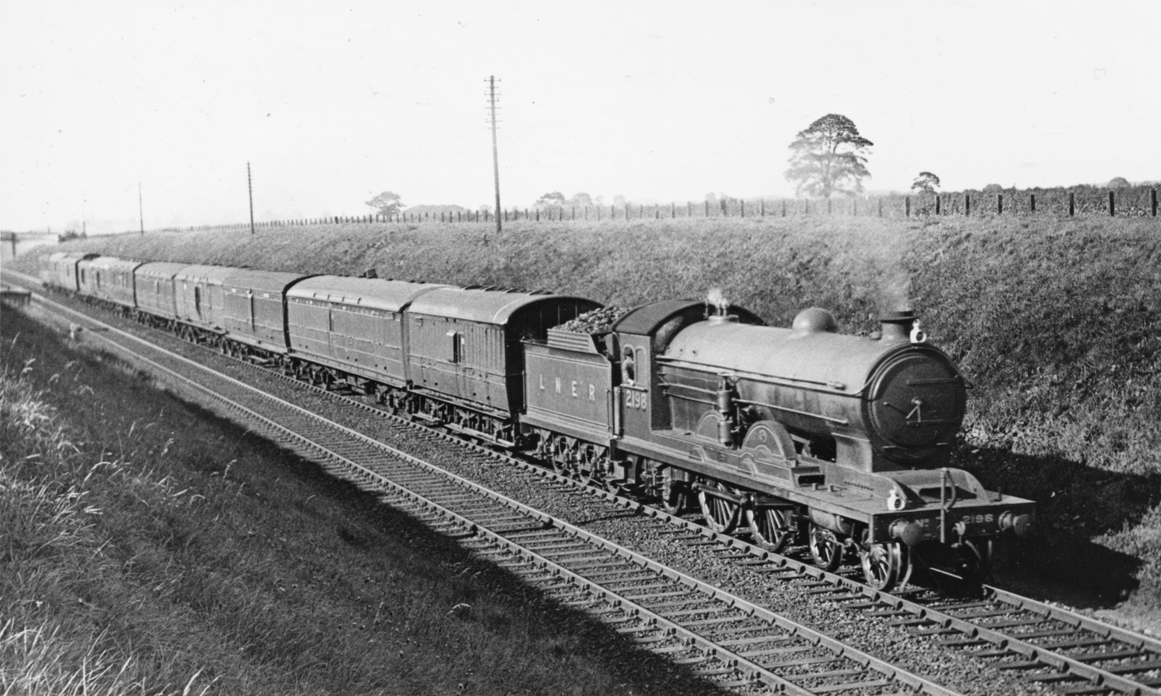 It's 1926 (and alas slightly blurred) near Covey and A2 No 2402 City of York has a secondary express made up with ex-NER clerestory carriages and, behind the tender, a through van. It's a 56'6" Doncaster-built BG which may have been in the ECJS fleet or from the GN Section. Photo: LGRP.