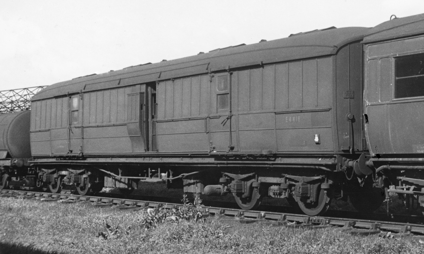A 56'6" BG originally built by the GNR in 1914 to GN.308 and in LNER days on the GN Section carried the number 441, is seen on 24.8.57 at Stratford with the late BR version, E441E. This is a wide panel version - both types were built and are easily recognised on static and most of the train views. The original gas lighting had been replaced by electric lighting. Photo: H.C. Casserley.