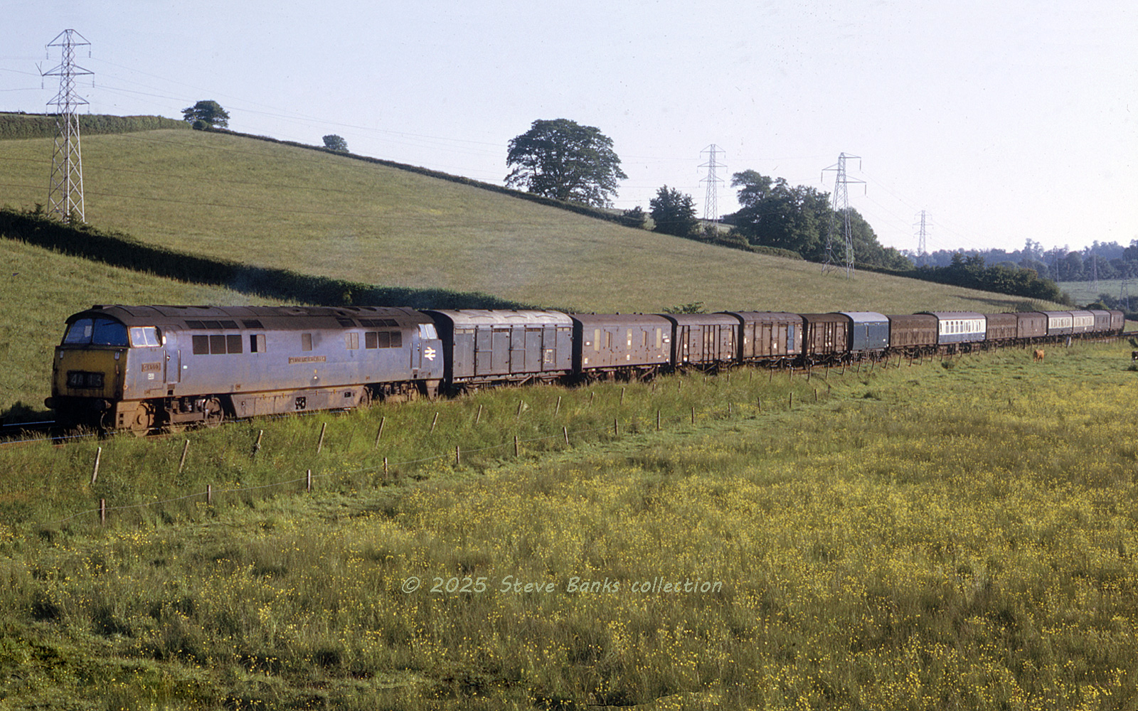 This image is dated Thursday 13th June 1974 but the location is not identified. With the sun beginning to set "Western" diesel hydraulic No D1063 Western Monitor also has 14 vans in which the 6th one is an ex-ER 6w Luggage Parcels Van recently serviced in BR blue with quite a pale grey roof. Photographer unknown, author's collection.