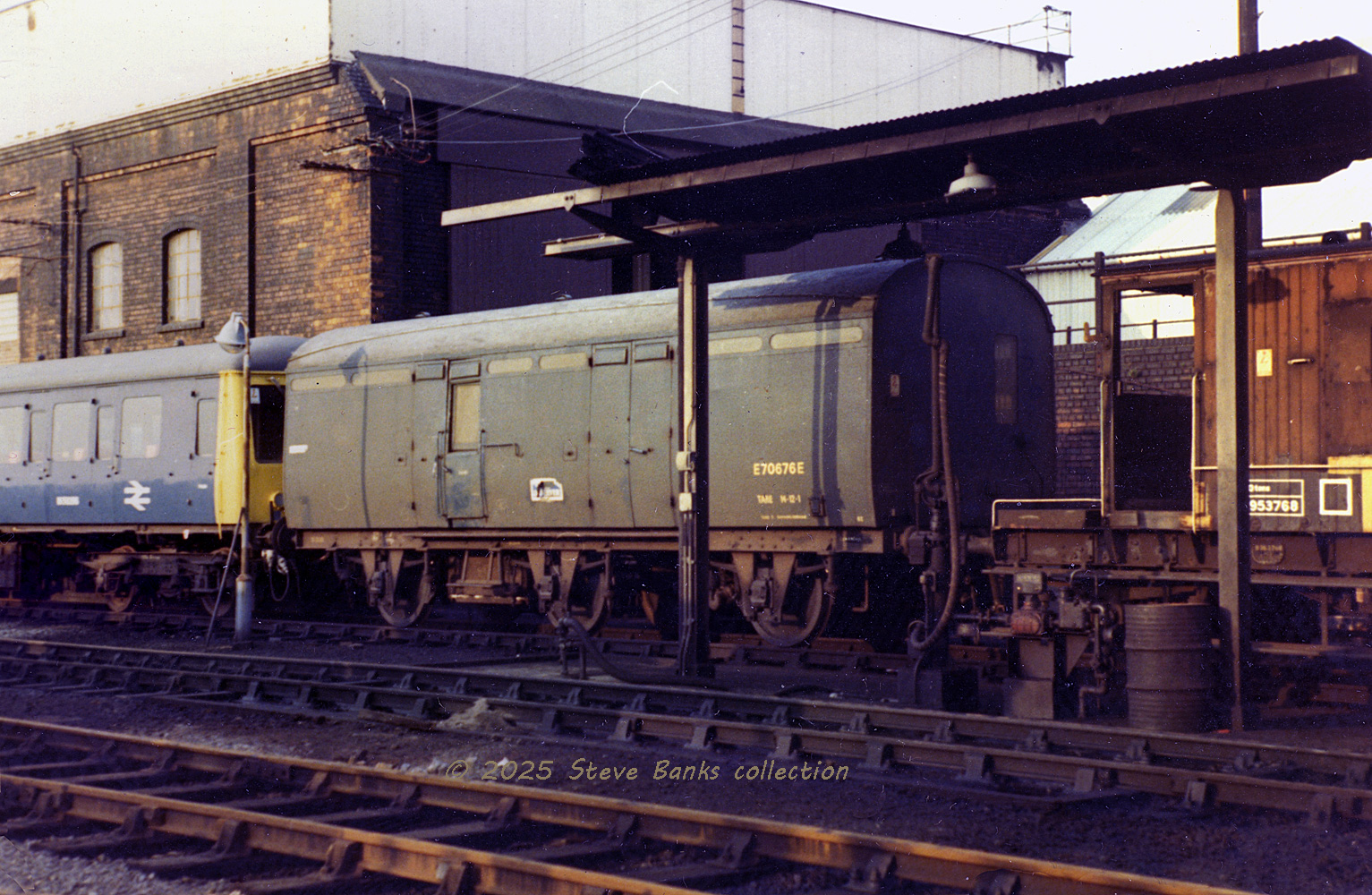 BR blue - the final picture in this section shows E70634E at Crewe in 1970. The condition is still excellent and the livery is BR Rail Blue. Not being a passenger carrying vehicle and only 24 years old, it had survived the cull of wood-panelled passenger carriages (of which the longest lived survivors were the Gresley buffet cars) and was still in service. Note the bogie van behind, a Gresley 61'6" BG with steel panelling. Photo: author's collection.
