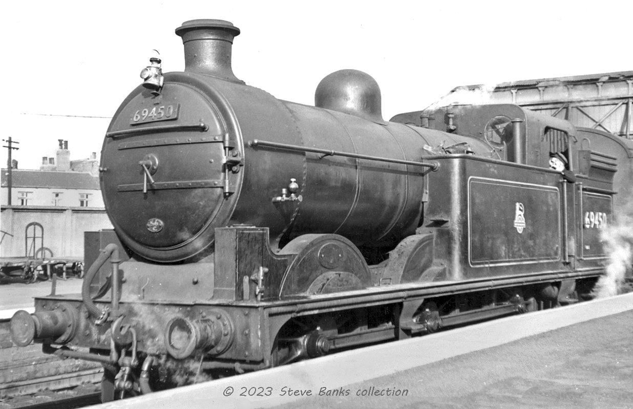 N1 No 69450 is in the mixed traffic livery, on the long-lasting steam-hauled service to Castleford. It was one of the longest lived locos and not withdrawn until March 1959.