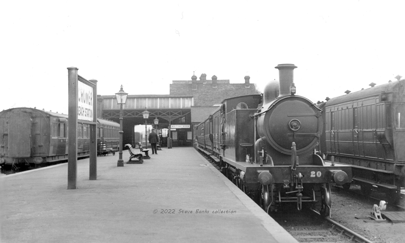A year later (1929) and Class A 4-4-2T No 20 stands at Cromer Beach with a similar 4-set. Alongside can be seen another M&GN 6w brake van. Photo: H.C. Casserley 6081.