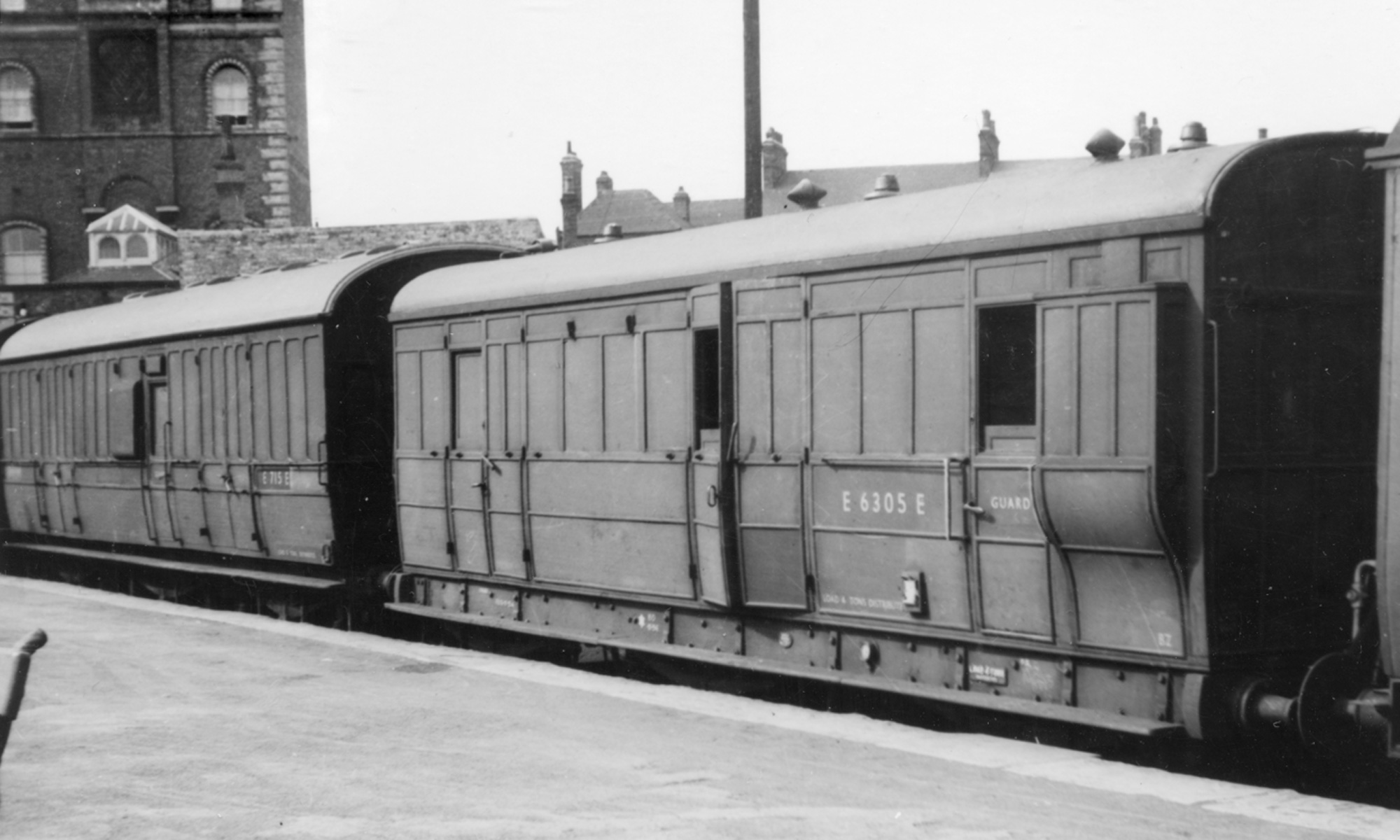 A year later in 1957, the same van, E6305E is seen again; location unknown, Note how the location for the lamp over the ducket has been sealed; lamps were now carried on lamp irons on the body end. Photo: R.S. Carpenter.