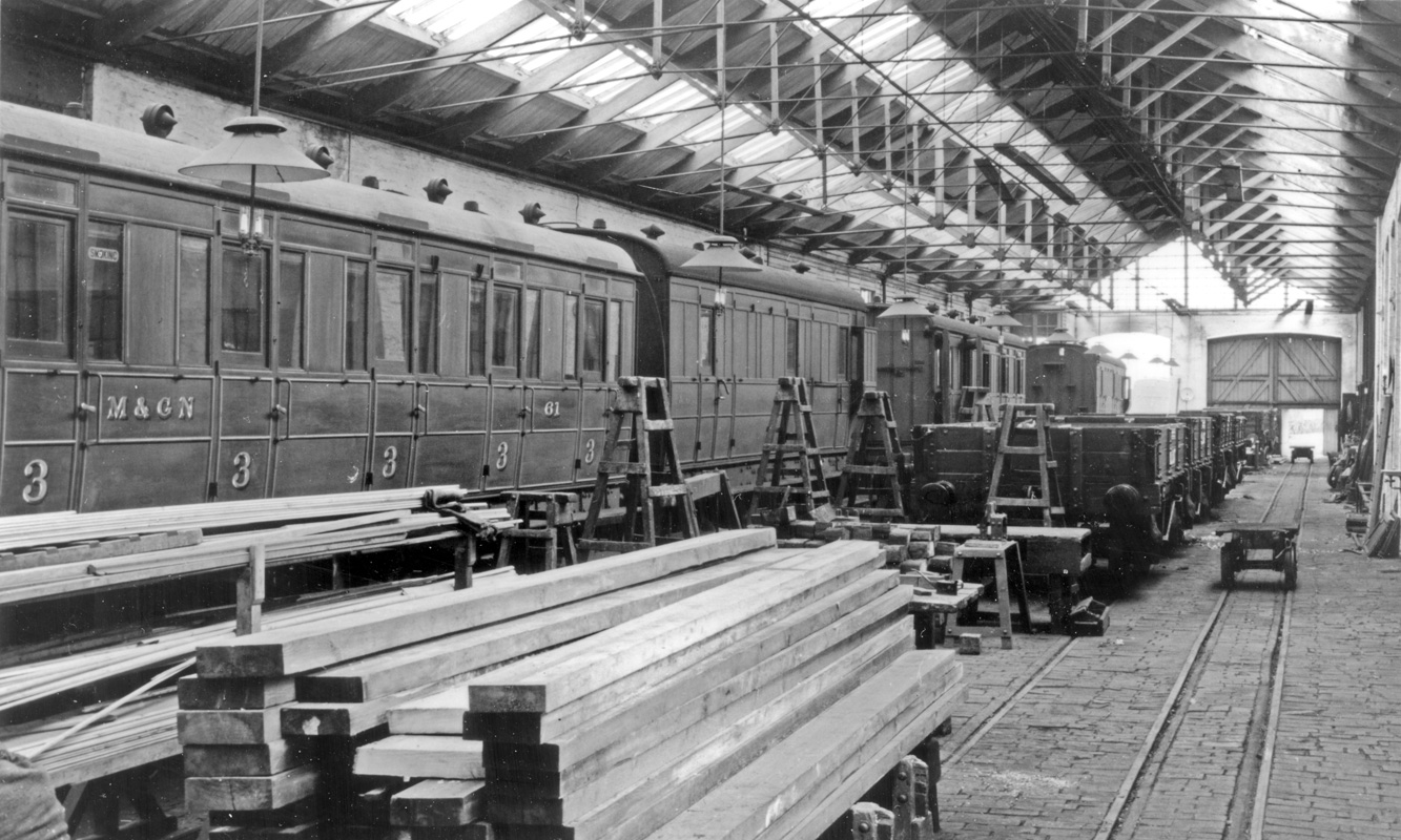 This is the earliest view I have of these vans, taken somewhere around 1925-35 inside the carriage works at Melton Constable and though distant, it's too pleasing a scene not to show whole. From left to right the stock, all 6w, is: ex-GNR 3rd No 61, M&GN B, unidentified 6w, M&GN B. The brake on the far right is useful for showing the end steps and handrail. Photo: SLS.