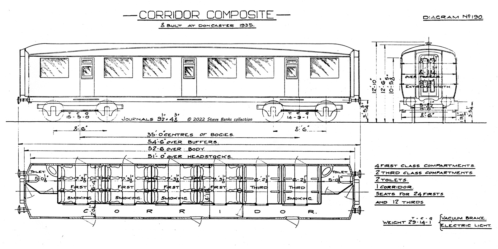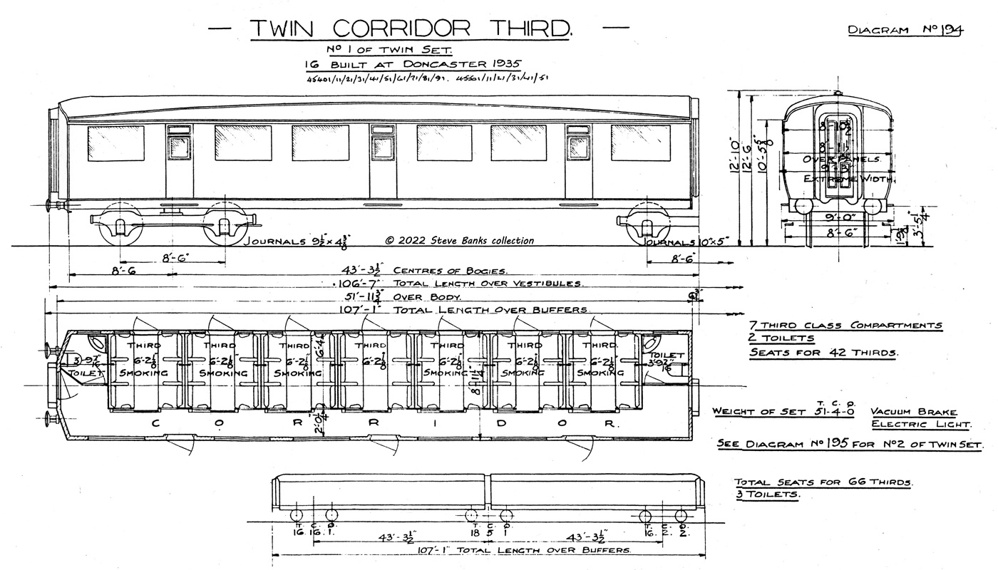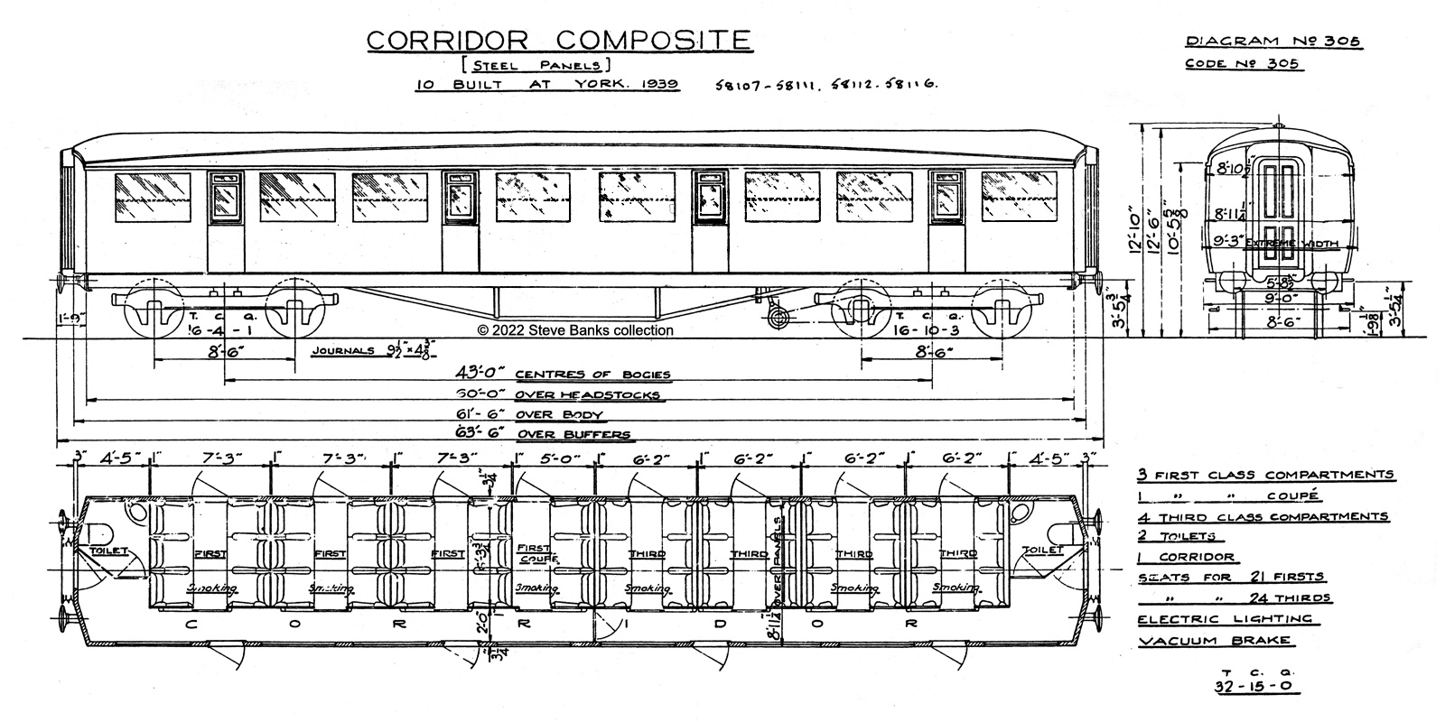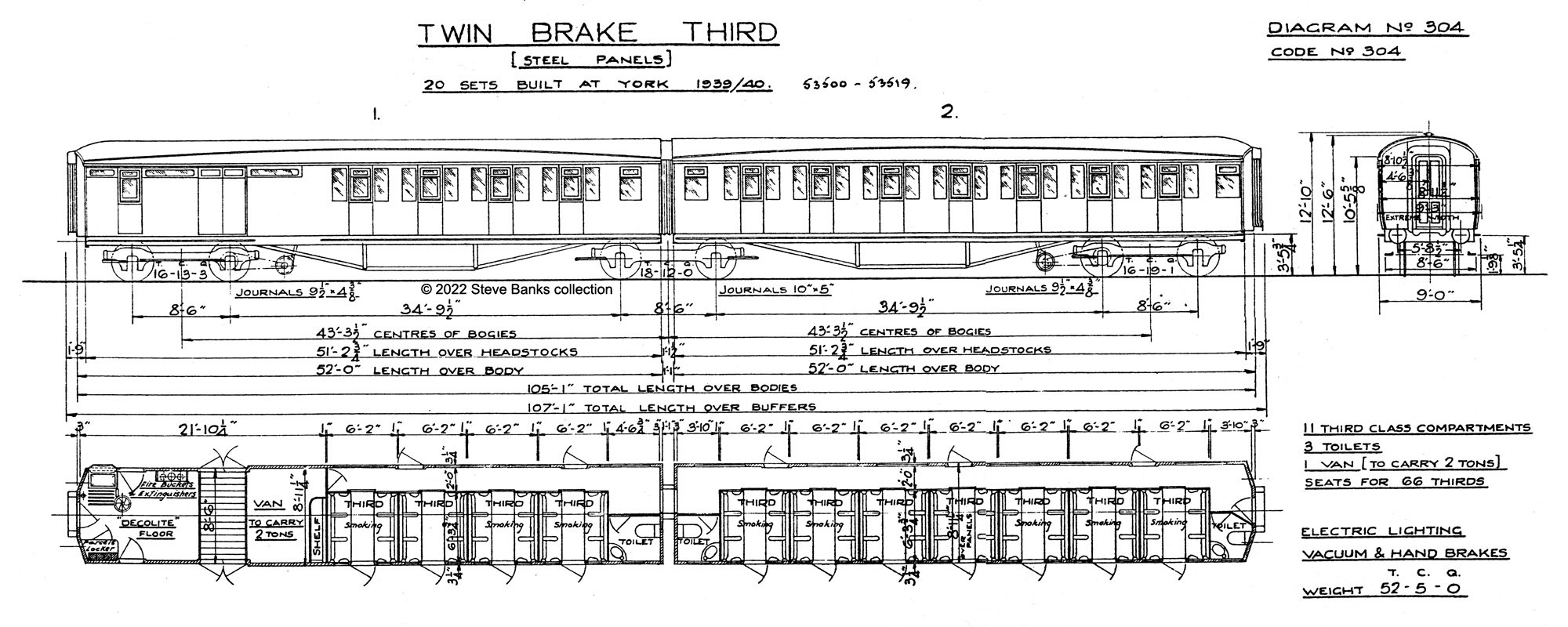 This is D.304 for the twin. During the late 1930s Diagrams for articulated carriages began to show complete arrangements where previously separate Diagrams had been produced for individual carriages. The steel angle trussing is shown, too. However, introduction of a sliding ventilator and bonnet on the guard's door is not shown. It could have been a late change or a mistake by the draughtsman and it's not the first time that I have drawn attention to this kind of thing. An interesting detail is that nearly all the compartments were "smoking", very few catered for non-smokers at the time. Diagram author's collection.